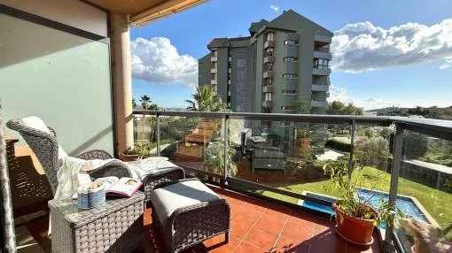 Descripción del inmueble: Esta casa adosada mediterránea está situada en el pintoresco pueblo de Costa de la Calma y ofrece unas impresionantes vistas al mar. La casa, construida en 1990, se extiende sobre 3 plantas y ofrece un generoso 187 metros cuadrados de espacio habitable. En el interior, la propiedad se presenta en un estado atractivo. El amplio salón es de planta abierta, conectado a una espaciosa cocina y ofrece acceso a la generosa terraza con increíbles vistas al mar y toldo retráctil. En la planta baja hay 2 acogedores dormitorios con baños en suite, uno con bañera y otro con ducha. La planta superior alberga una oficina que se puede convertir en un 3er dormitorio con baño en suite si es necesario - una opción práctica para los huéspedes o familias en crecimiento. Lo más destacado de la casa es sin duda la 3ª planta, que ofrece acceso a la hermosa terraza de la azotea. Aquí no sólo podrá disfrutar de unas impresionantes vistas al mar, sino también de delicias culinarias en la cocina exterior cubierta. Para los días calurosos, hay un toldo que proporciona una agradable sombra y garantiza así agradables momentos de relax. Todo el complejo en el que se encuentra la casa adosada está cuidadosamente ajardinado y bien mantenido. Numerosas plazas de aparcamiento están disponibles para el uso gratuito de los residentes, lo que ofrece una comodidad adicional. Aunque el complejo no dispone de piscina propia, actualmente los residentes pueden utilizar gratuitamente la gran piscina del hotel vecino, lo que es una forma agradable de refrescarse y relajarse en los días cálidos. Lugar & alrededores: Costa de la Calma es una zona residencial de mucha tranquilidad y gran belleza paisajística, que se extiende entre Santa Ponça y Peguera. En su litoral se encuentra la playa de Cala Blanca que se caracteriza por ser rocosa y tener diversas entradas en el mar además de pequeñas calas de piedras.