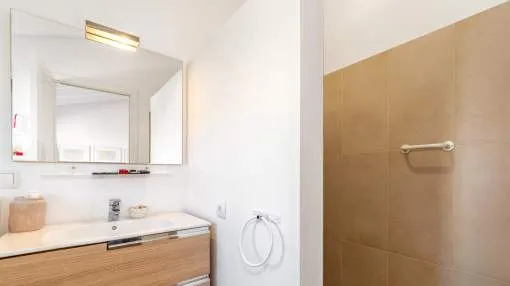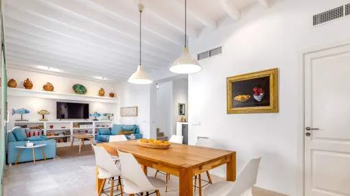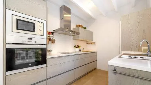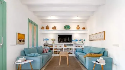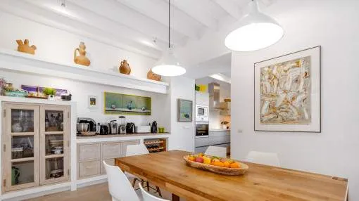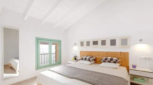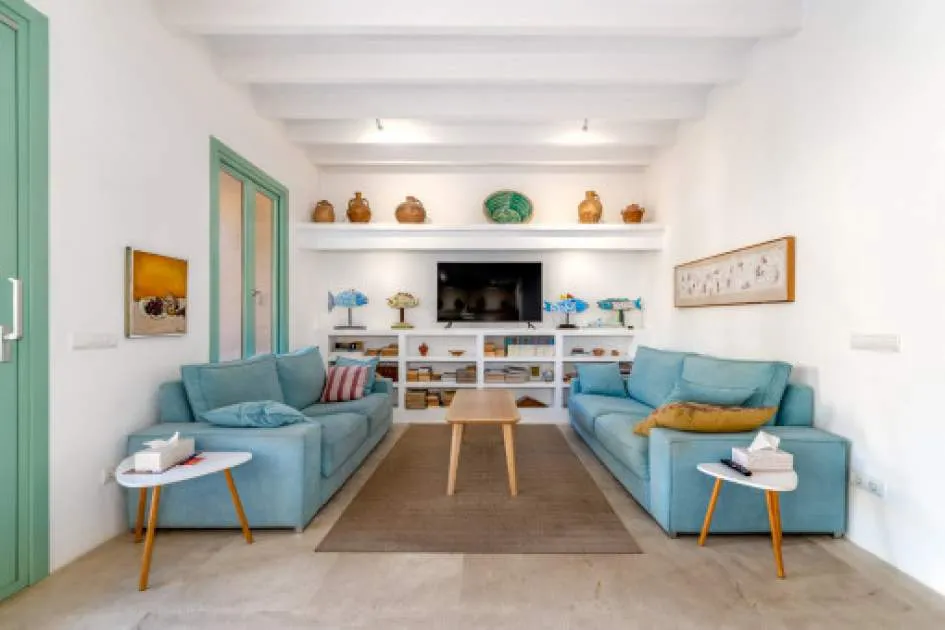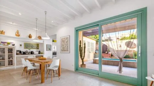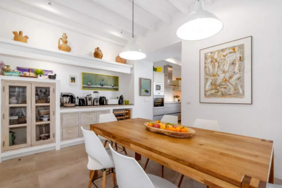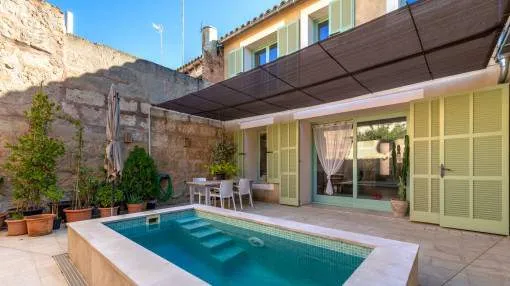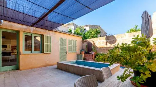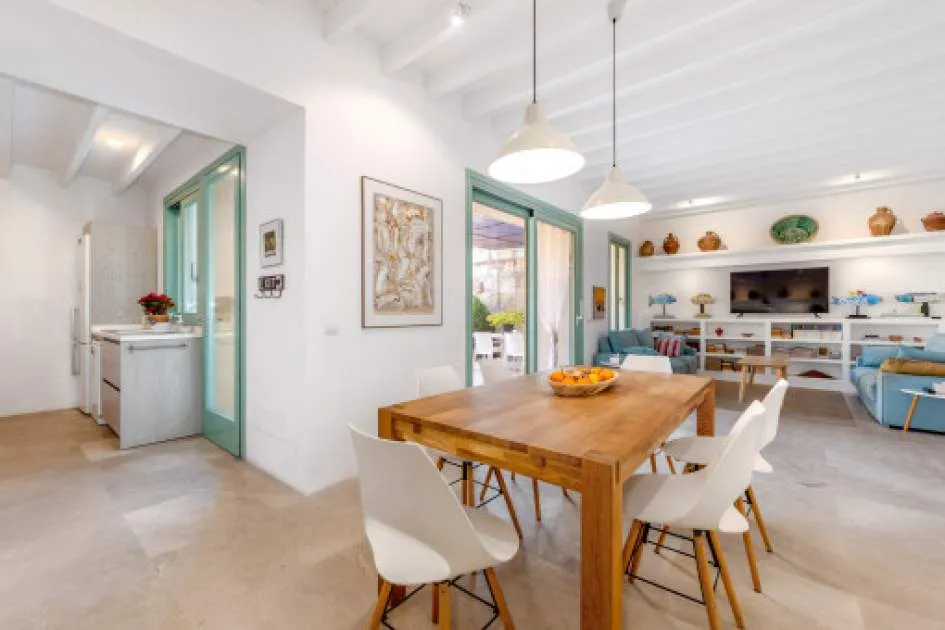 Descripción del inmueble: Esta casa de pueblo reformada con materiales de alta calidad y orientada al suroeste se encuentra en una tranquila calle lateral en el centro del bonito pueblo de Sineu. La superficie habitable de 217 metros cuadrados se distribuye en 2 plantas. En la planta baja hay una amplia zona de entrada con un baño para invitados, un salón-comedor abierto, una cocina con acceso directo al garaje y un trastero grande. Además, el salón cuenta con un gran ventanal con acceso a la terraza. En la primera planta hay un rincón de lectura, así como 3 dormitorios dobles con baños en suite, uno con su propia terraza. El patio, diseñado con mucho cariño, cuenta con una pequeña zona de barbacoa y una piscina. Otras características incluyen aire acondicionado frío/calor y una estufa de pellets. Todas las instalaciones fueron realizadas por una empresa alemana. Lugar & alrededores: Sineu es geográficamente el pueblo más central de Mallorca y está situado en la región Es Plà. Una de las atracciones es la iglésia Nuestra Senyora de los Ángeles o el Convento de las Monjas. La atracción principal es el mercado semanal de ganado y artesanal. Sineu tiene 3000 habitantes.