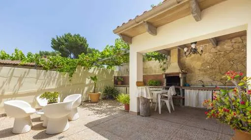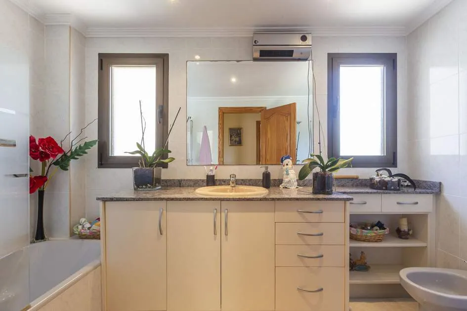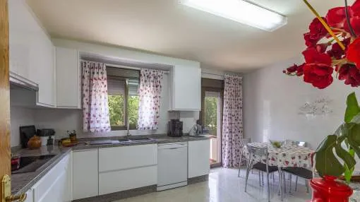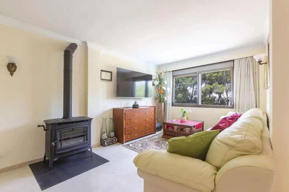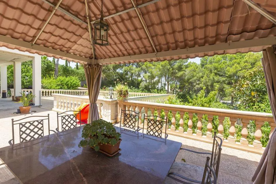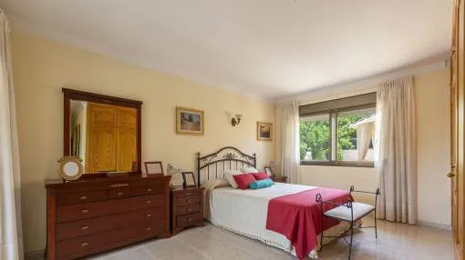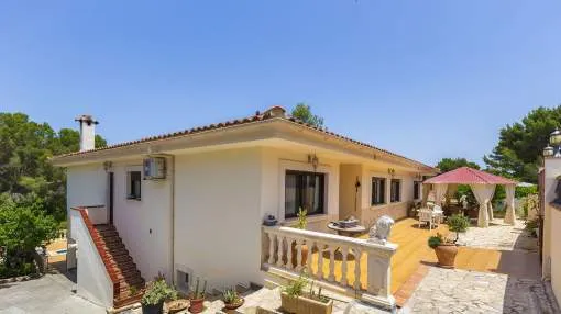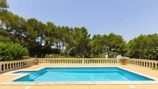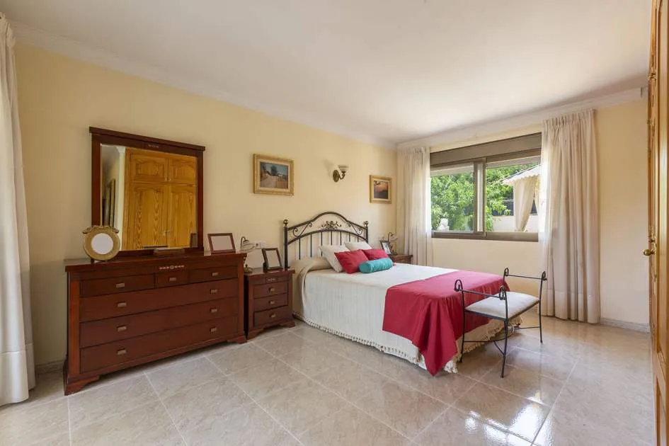 El chalet de estilo mediterráneo clásico es el chalet familiar ideal. Ofrece mucho espacio y una amplia zona exterior con piscina, zona de barbacoa, amplias y acogedoras terrazas y un hermoso jardín mediterráneo con árboles frutales. La propiedad se encuentra en una urbanización de chalets muy tranquila y exclusiva que bordea una reserva natural. A poca distancia hay un campo de golf y dos puertos deportivos, así como hermosas playas y calas. El centro de Santa Ponsa con su playa de arena blanca, tiene acceso a la autopista y todos los servicios están a menos de dos kilómetros. La zona de estar en el nivel superior de la entrada se divide en el salón/comedor, la bonita y amplia cocina con zona de comedor y escalera exterior, el dormitorio principal con baño en suite y terraza, dos dormitorios más que comparten un baño y una habitación que puede utilizarse como despacho/sala de juegos. En el nivel inferior de la piscina hay un comedor de verano, un taller, varios trasteros, cochera y aparcamientos para máximo siete coches.
