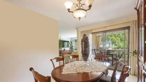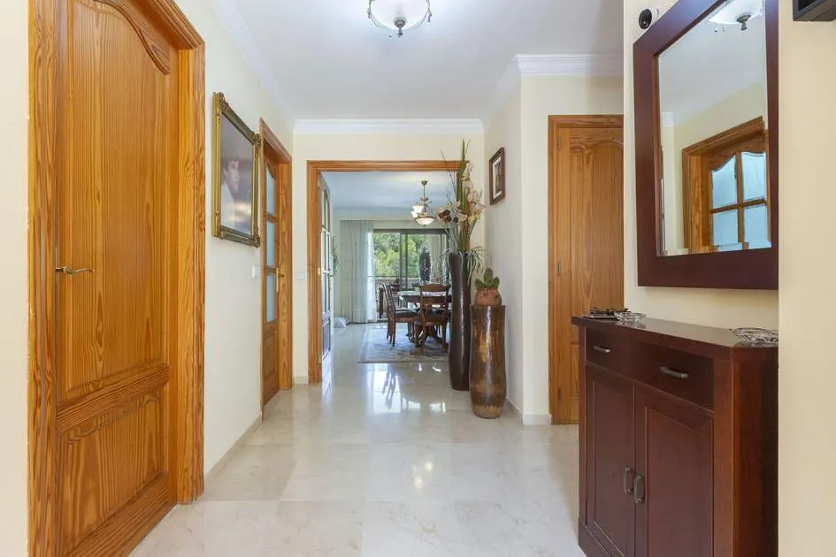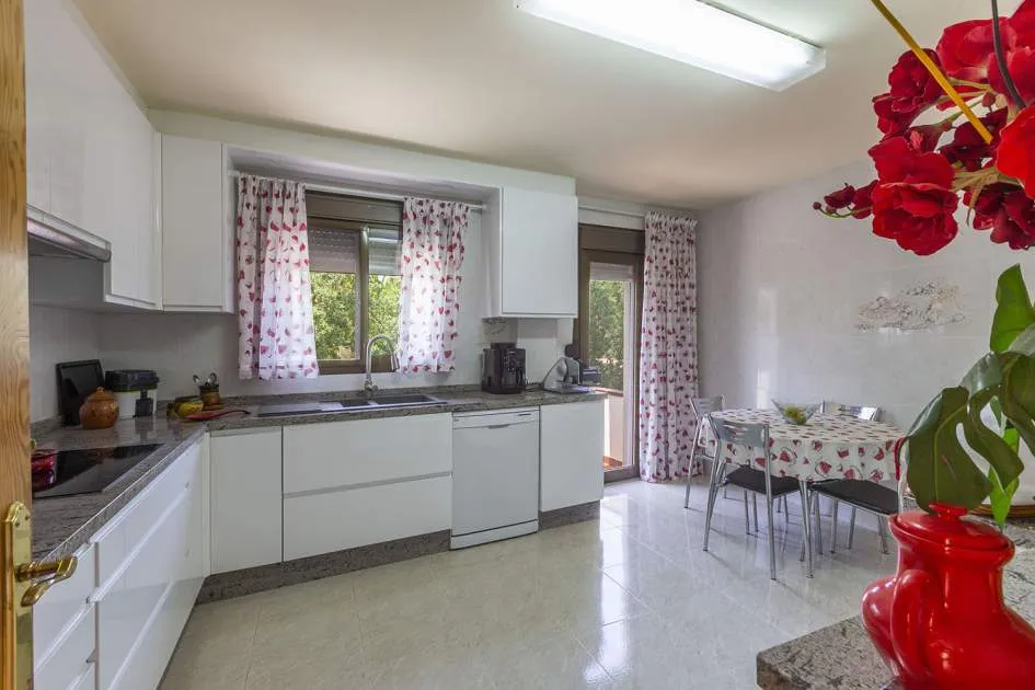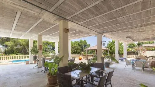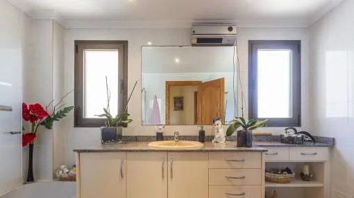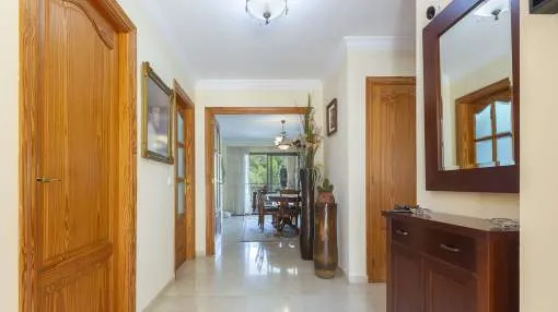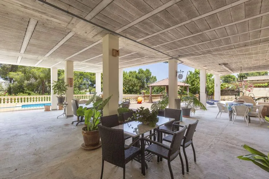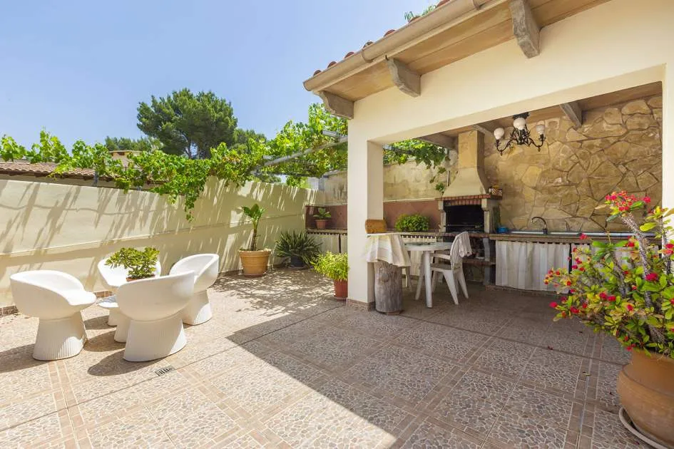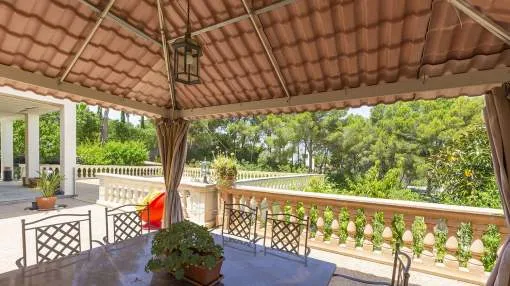 El chalet de estilo mediterráneo clásico es el chalet familiar ideal. Ofrece mucho espacio y una amplia zona exterior con piscina, zona de barbacoa, amplias y acogedoras terrazas y un hermoso jardín mediterráneo con árboles frutales. La propiedad se encuentra en una urbanización de chalets muy tranquila y exclusiva que bordea una reserva natural. A poca distancia hay un campo de golf y dos puertos deportivos, así como hermosas playas y calas. El centro de Santa Ponsa con su playa de arena blanca, tiene acceso a la autopista y todos los servicios están a menos de dos kilómetros. La zona de estar en el nivel superior de la entrada se divide en el salón/comedor, la bonita y amplia cocina con zona de comedor y escalera exterior, el dormitorio principal con baño en suite y terraza, dos dormitorios más que comparten un baño y una habitación que puede utilizarse como despacho/sala de juegos. En el nivel inferior de la piscina hay un comedor de verano, un taller, varios trasteros, cochera y aparcamientos para máximo siete coches.