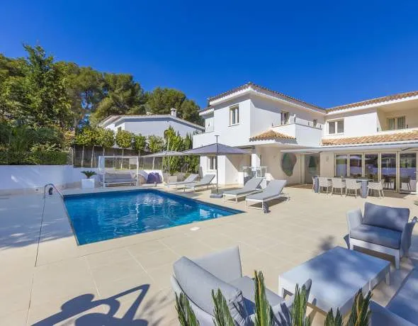El chalet, modernizada en 2018, se encuentra en una zona residencial tranquila y exclusiva, a un paso de una pequeña playa de arena. El Club Náutico y el centro de Santa Ponsa, con su amplia infraestructura, igual que los campos de golf locales se alcanzan en pocos minutos en coche. La casa se desarrolla en tres plantas. En el nivel de entrada en la primera planta se encuentran el amplio y muy luminoso salón-comedor con una cocina abierta, un dormitorio con baño en suite y un aseo. En este nivel hay acceso a una terraza cubierta (con calefacción por suelo radiante) y a la zona de la piscina con un acogedor lounge y mucha privacidad. En la planta superior hay tres dormitorios con baños en suite y una terraza con vistas panorámicas. Además, cuenta con un garaje grande, un lavadero y una sala técnica a pie de calle.