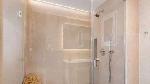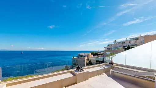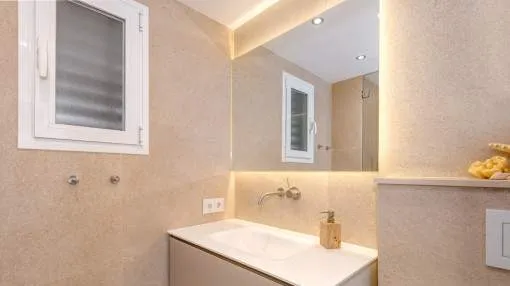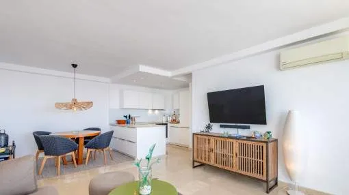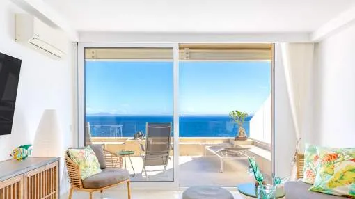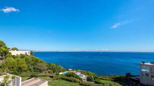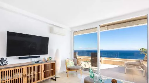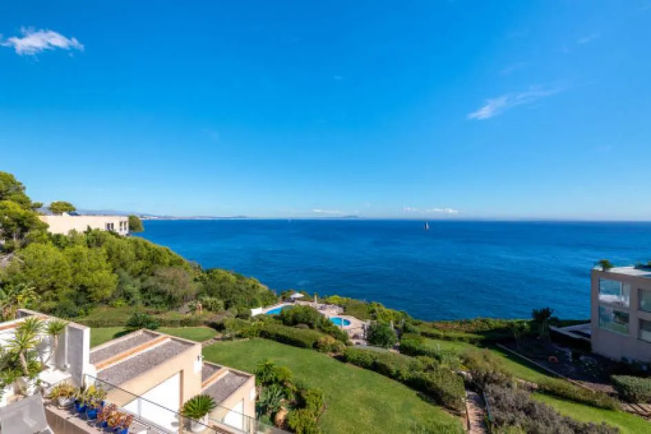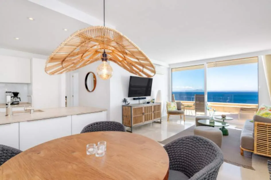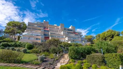 Descripción del inmueble: En una tranquila zona de Cala Viñas se encuentra este apartamento completamente renovado, situado en una cuidada comunidad directamente sobre los acantilados, con piscina de agua salada y acceso privado al mar. La playa de arena de Cala Viñas está a pocos minutos a pie, y en coche se llega rápidamente a tiendas y a numerosos restaurantes en Sol de Mallorca y Magaluf. Palma se encuentra a unos 15 km y el aeropuerto a aproximadamente 30 km. El apartamento ofrece unos 70 metros cuardados de superficie habitable y ha sido renovado íntegramente con materiales de alta calidad. El luminoso salón-comedor con cocina abierta da acceso a una terraza de unos 30 metros cuardados, desde la cual se puede disfrutar de impresionantes vistas al mar. Dispone de dos dormitorios, ambos con vistas al mar, un baño en suite con ducha y un aseo de invitados. Entre sus características destacan aire acondicionado en todas las estancias, ascensor en el edificio y una plaza de aparcamiento exterior dentro del recinto cerrado de la comunidad. La urbanización está perfectamente mantenida y ofrece espectaculares vistas al mar y una piscina de agua salada. Un refugio ideal de vacaciones, que combina tranquilidad, vistas al mar y confort moderno sin compromisos. Lugar & alrededores: La urbanización Cala Vinyas se encuentra en medio de un bosque de pinos con caminos tranquilos y pequeñas calas. Gracias a una buena infraestructura y la cercanía a la capital Palma (aprox. 15 km) Cala Vinyas esta ofreciendo un idilio rural en una zona vivaracha del suroeste. La cala de Cala Vinyas es una buena alternativa para la gente, quienes prefieren las calas pequeñas en vez de playas grandes y ruidosas. El casino cercano con su fantástico show ofrece una variedad bienvenida a la calma paradisíaca. Una ubicación interesante gracias a la buena comunicación a la autopista y a los puertos deportivos de Portals y Adriano. Los campos de golf de Poniente y de Santa Ponsa están a solo 10 minutos en coche.