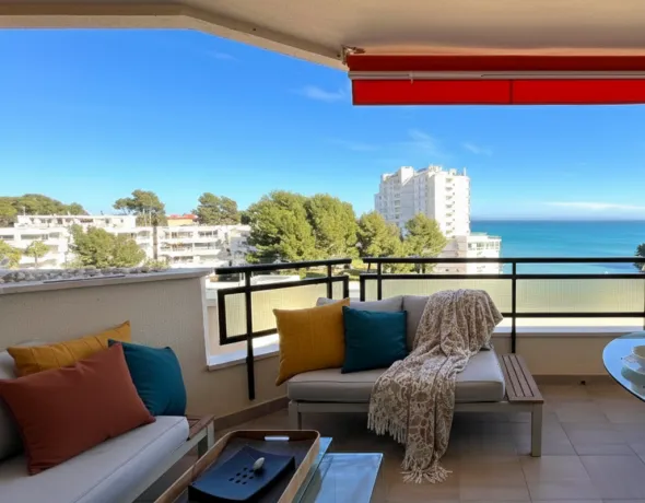 El apartamento destaca por su luminosidad y su amplia terraza con vistas panorámicas al mar, ideal para disfrutar de amaneceres inolvidables o cenas al aire libre. Dispone de dos dormitorios acogedores, dos baños renovados y una moderna cocina abierta completamente equipada, pensada para una vida relajada junto al mar.