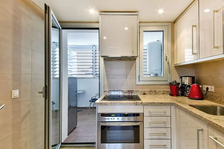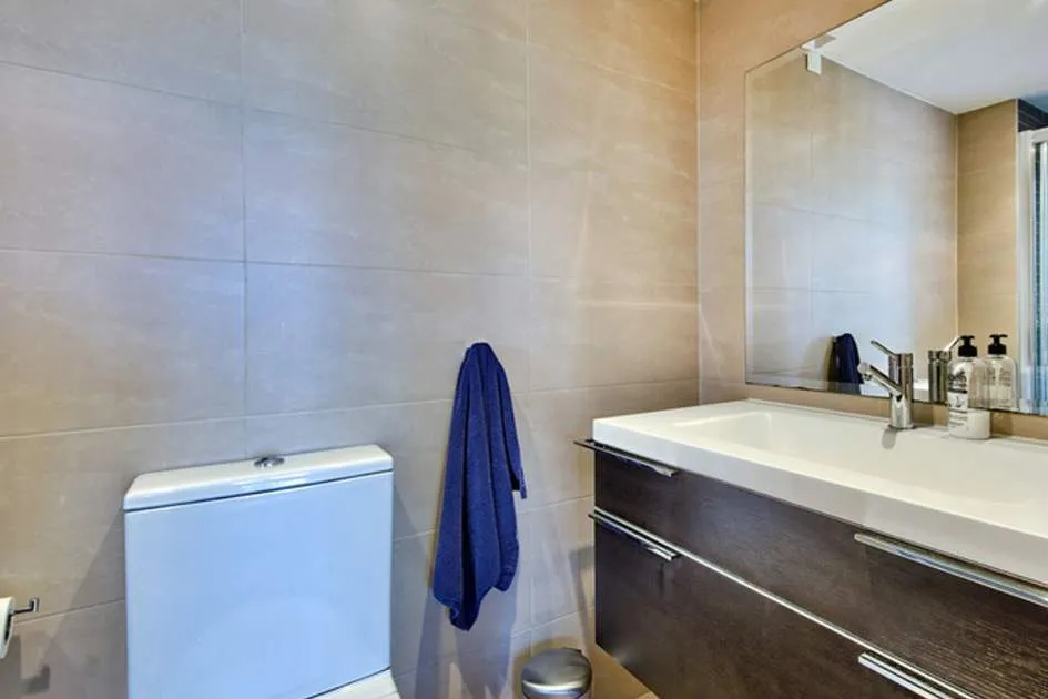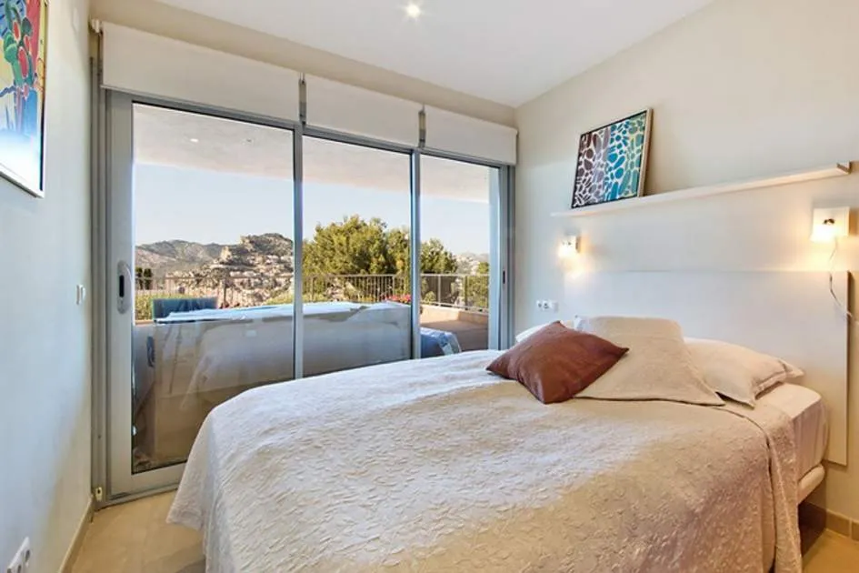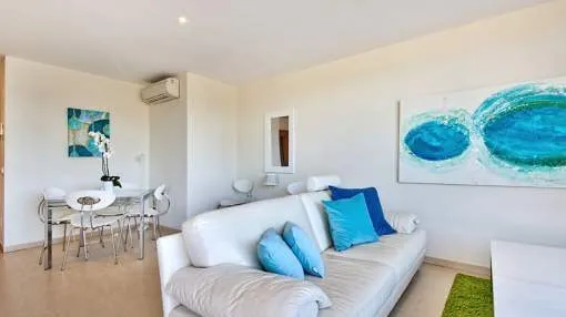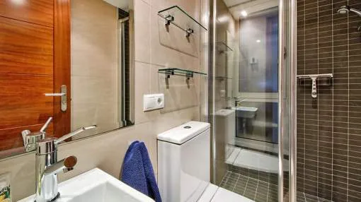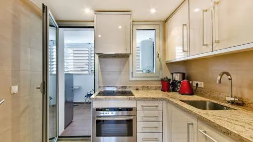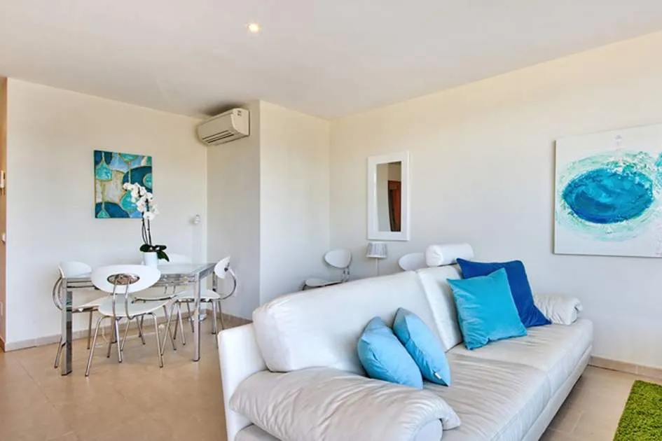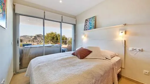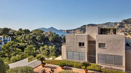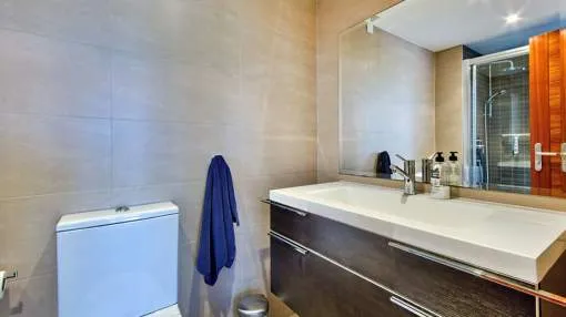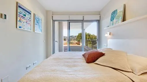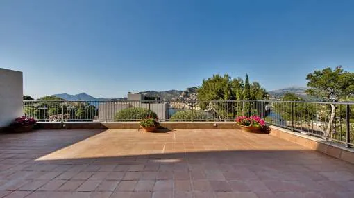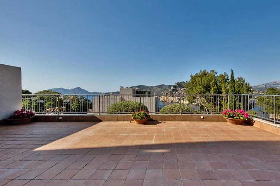 Apartamento bajo, con vistas muy bonitas al puerto y la isla Dragonera. El piso cuenta con dos dormitorios, uno de ellos con baño en suite y otro baño completo. La cocina da acceso a un gran espacio que puede servir de lavandería, trastero y terraza cubierta. Desde el salón-comedor, donde da un acceso directo a un gran porche y una terraza descubierta enorme. El apartamento se vende con una plaza de garaje y un trastero.