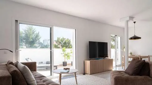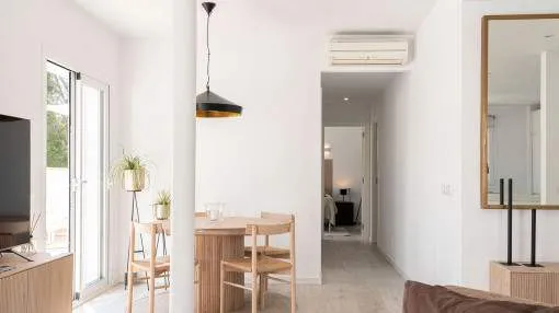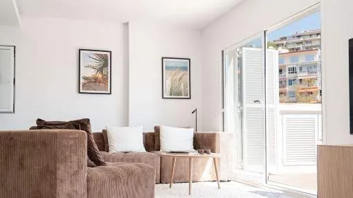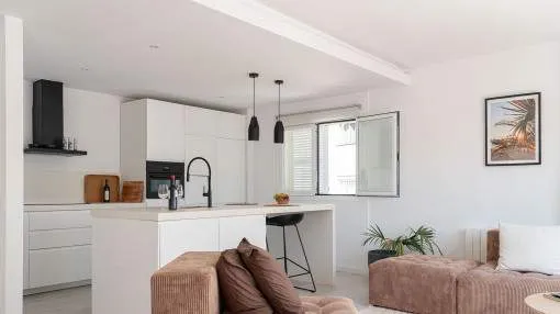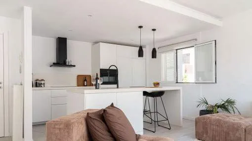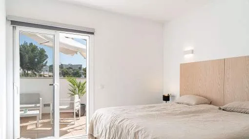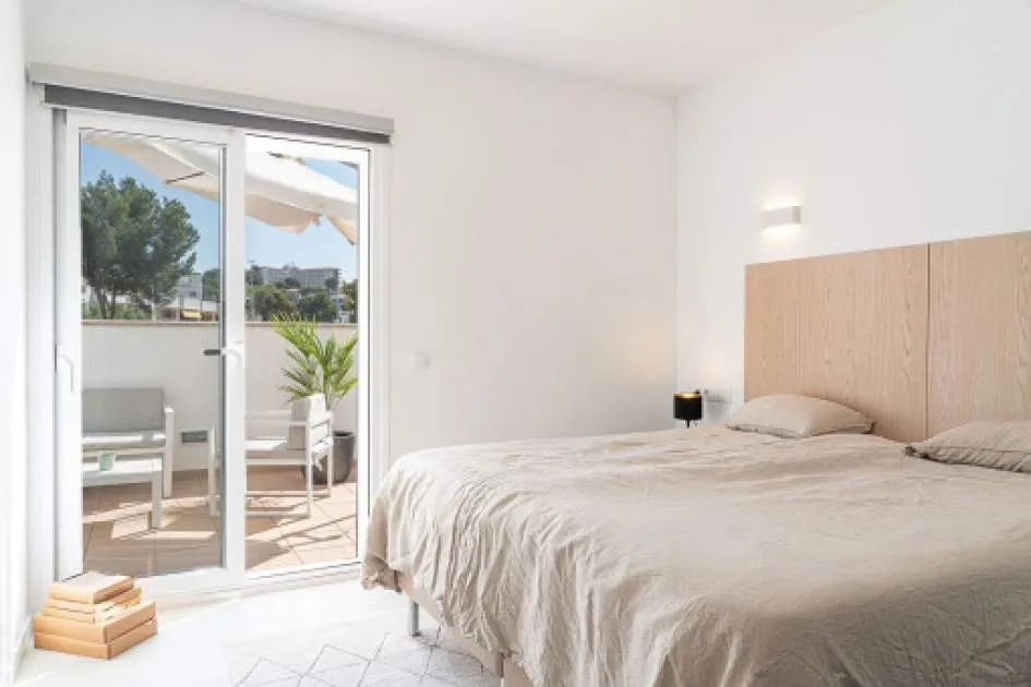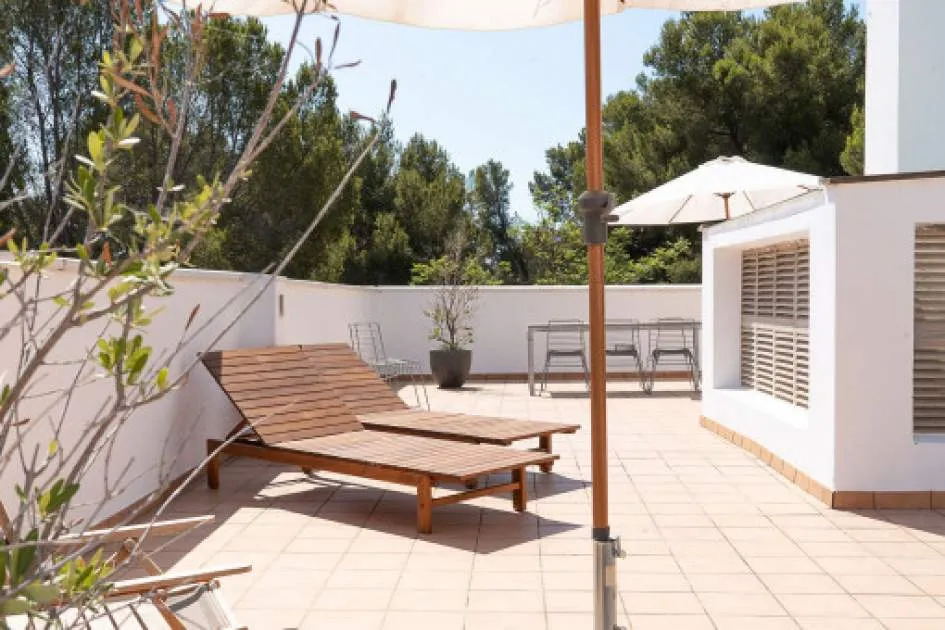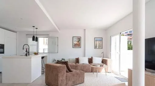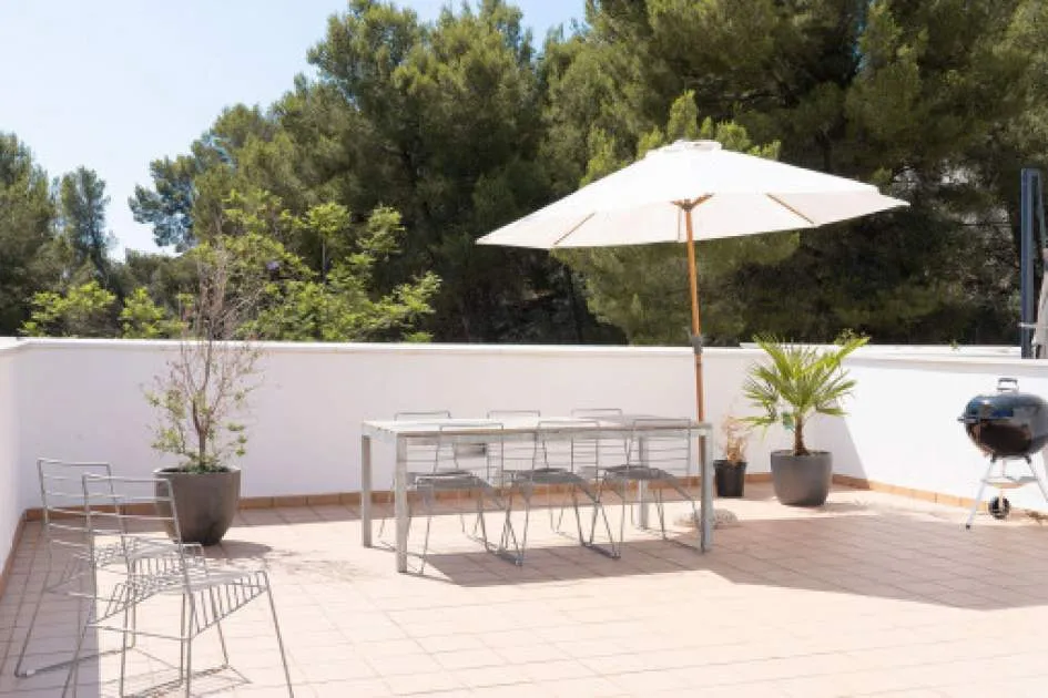Details: In the middle of San Agustín, a quiet and mature residential area of Palma, lies this newly renovated penthouse in a well-kept, small building with only 3 floors. The location combines privacy and proximity to the sea - the beach is just a few minutes' walk away. A particular highlight is the spacious outdoor area: directly on the living level, a sunny terrace of approx. 40 m² extends across the entire width of the apartment. In addition, the private, approx. 84 m² roof terrace invites you to spend relaxing hours with plenty of privacy and far-reaching views. The apartment offers approx. 98 m² of interior design space and boasts an open, light-flooded floor plan. The living and dining area flows seamlessly into the modern kitchen. Two bedrooms with space for double beds and 2 bathrooms - one of which is en suite - create a comfortable living ambience. Features include air conditioning, water filter system, elevator and a spacious garage parking space. A communal pool area rounds off this attractive offer. Location & surrounding area: In the coastal area of San Agustin you will feel as if you are on holiday the whole year round. Situated next to Cala Mayor its wonderful location on the Mediterranean is only 15 minutes by car from Mallorca's capital. This quiet area attracts both tourists and local residents who work in the surrounding areas due to its excellent connections to the town of Palma, the airport and the south-west of the island. All amenities can be found here and include the popular minimalist Zhero, good fitness studios, diverse shops and a pharmacy. In addition it has all kinds of restaurants with local and international dishes, all offering wonderful views of the sea. Also close by is the Club Nautico de Cala Nova, famous for its sailing and kite-surfing courses. San Agustin consists mainly of residential buildings most of which provide good views of the Mediterranean due to the elevated location of the area. Most of the apartments also have a communal pool and gardens.