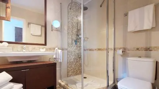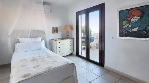 El salón-comedor es el centro de la vivienda y se abre a la azulada franja del Mediterráneo. La espectacular vista al mar desde la terraza es encantadora todos los días. Los dos dormitorios ofrecen paz y relajación después de pasar días llenos de actividades en la costa mallorquina.