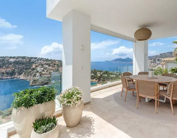 Esta moderna villa con ascensor ha sido objeto de una reforma integral de la más alta calidad. Está situada en una zona residencial muy solicitada, en lo alto de Cala Marmacén, con vistas a la bahía, a la península de La Mola y a la isla Dragonera. La casa goza de magníficas vistas al mar y panorámicas. La vivienda principal en la planta baja cuenta con un luminoso salón/comedor con cocina abierta de diseño, una bodega, un amplio dormitorio en suite con vestidor, un dormitorio con baño en suite, un aseo de invitados y una gran terraza cubierta. En la planta superior se encuentra el amplio dormitorio principal con vestidor, baño en suite y acceso a una terraza con vistas al mar, así como otros dos dormitorios con vestidor y baño en suite. El garaje doble también se encuentra en esta planta. Además, una sala de fitness, una gran sala polivalente y un aseo de invitados están disponibles en el sótano en el nivel de la piscina. En el exterior, la villa convence con amplias zonas de terraza cubiertas y descubiertas con una piscina de agua salada integrada y un rincón de descanso. Un ascensor conecta cómodamente todos los niveles.