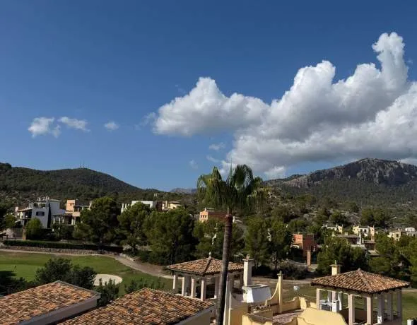 La sala de estar y comedor de planta abierta está en el primer piso. Esto tiene una cocina moderna equipada con una isla de cocina. Este nivel es muy luminoso a través de los ventanales altos y grandes y tiene una vista maravillosa sobre el campo de golf y hasta la Sierra de Tramuntana. También hay acceso a la azotea, desde la que se tiene una maravillosa vista panorámica sobre los tejados de Camp de Mar, el campo de golf y el mar. Una cocina al aire libre le invita a disfrutar del estilo de vida mediterráneo al aire libre.