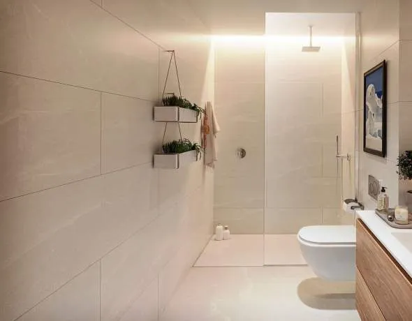 Se seleccionó gres porcelánico de gran formato para todas las estancias de los apartamentos. Las mismas baldosas se colocan en la versión antideslizante en el exterior.