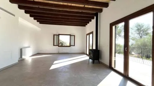 La vivienda, amplia y luminosa, se distribuye en dos plantas más sótano. En la planta principal destacan los espacios de día: un gran salón con estufa de leña, comedor independiente, cocina con salida a terraza, estancias polivalentes que se adaptan como despacho, sala de estar o dormitorios adicionales, además de un cómodo garaje.