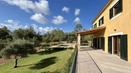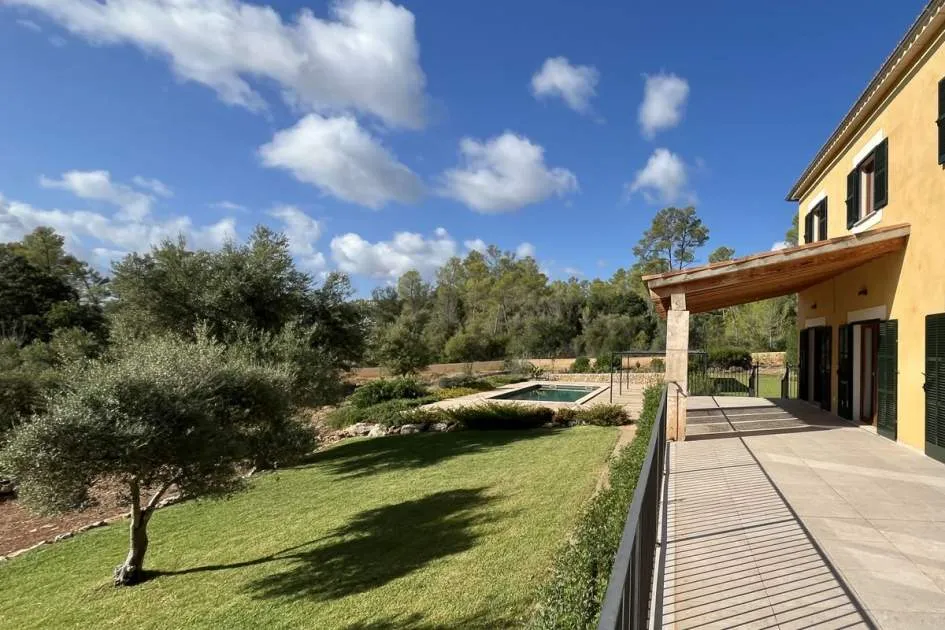 El exterior es uno de los grandes atractivos de la finca: piscina rodeada de solárium, porche semicubierto perfecto para comidas y cenas, y amplias zonas ajardinadas que aseguran total intimidad.