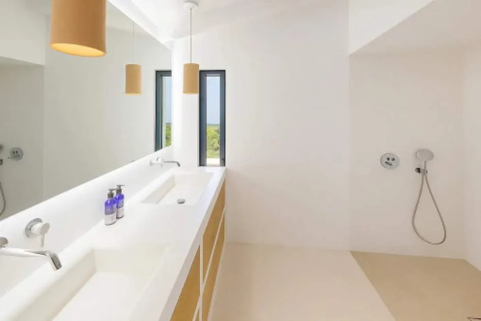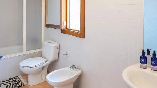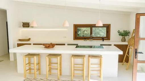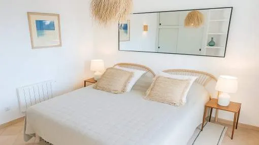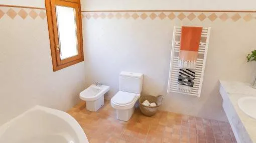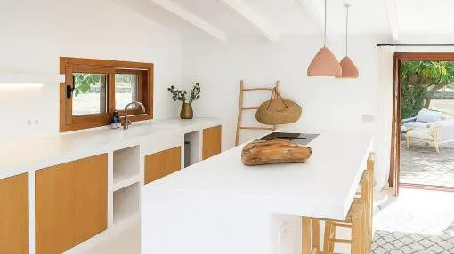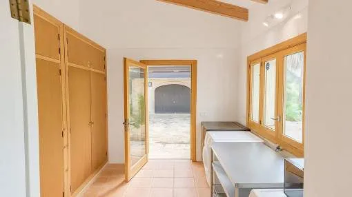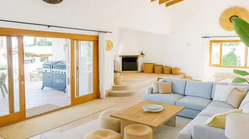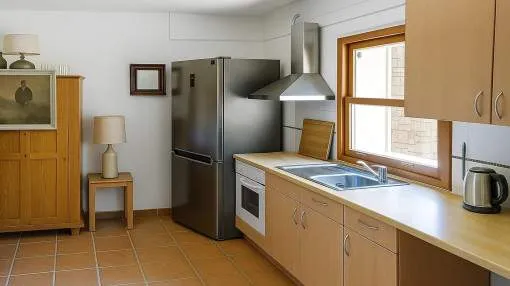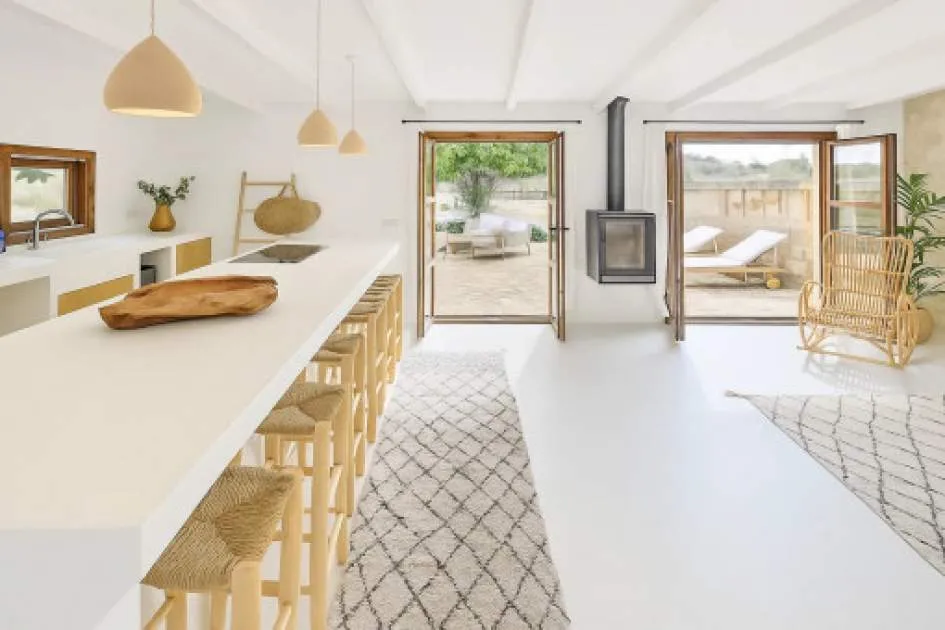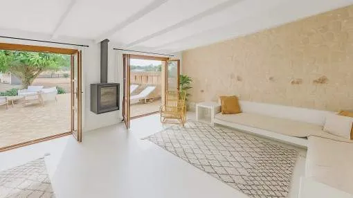 El salón principal impresiona por su arquitectura luminosa con techos altos, acristalamiento Climalit y un concepto de salón de planta abierta. El amplio salón con chimenea ofrece acceso directo a la terraza de la piscina orientada al este, que ofrece fantásticas vistas sobre la bahía y la llanura de Santa Margalida. Al lado hay una gran cocina, un práctico lavadero, así como 2 dormitorios y 2 baños. La calefacción por suelo radiante y los radiadores eléctricos adicionales garantizan temperaturas agradables durante todo el año.