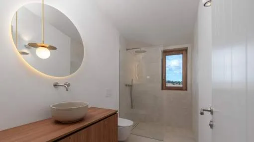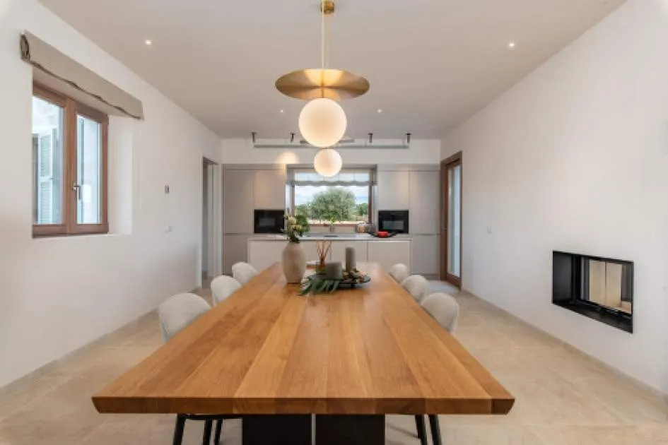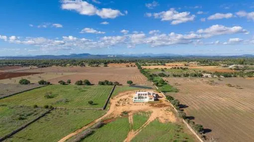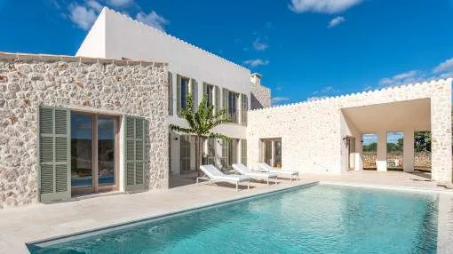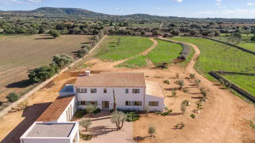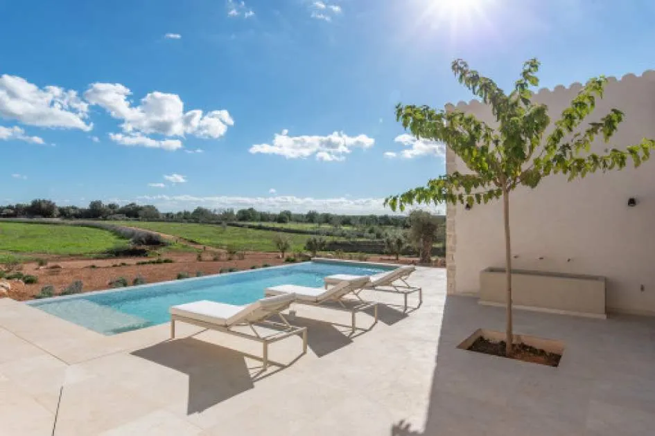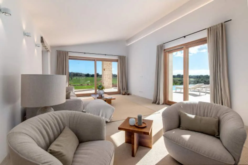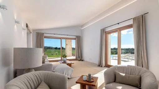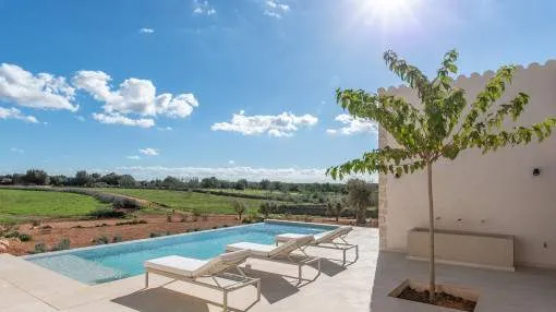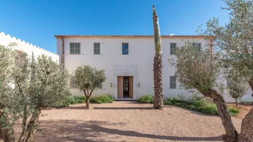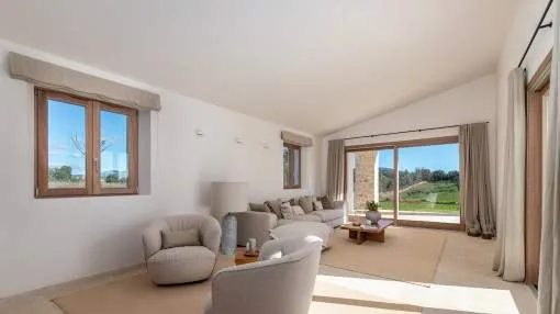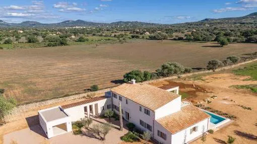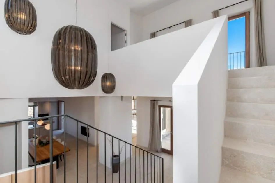 Descripción del inmueble: Esta elegante finca de nueva construcción está situada en las suaves colinas de Cas Concos, en una parcela de unos 21.900 metros cuadrados. Rodeada de naturaleza virgen y con impresionantes vistas panorámicas hasta las montañas, la propiedad combina la arquitectura moderna con el auténtico encanto de Mallorca. Un lugar donde la tranquilidad, la privacidad y el estilo de vida mediterráneo se unen en perfecta armonía. La finca fue construida con materiales exquisitos e impresiona por su equilibrada interacción de elementos de diseño contemporáneo, colores naturales claros y líneas claras y elegantes. Los amplios ventanales permiten la entrada de mucha luz natural y crean un ambiente cálido y acogedor. En la planta baja, la prestigiosa zona de entrada da paso a la sala de estar de planta abierta con comedor contiguo y moderna cocina con isla. Una elegante chimenea pone aquí un acento especial y crea un ambiente acogedor. Junto a la cocina hay un práctico lavadero y una acogedora terraza de desayuno con sol de mañana. Dos dormitorios con baños en suite y armarios empotrados y un aseo completan este nivel. La planta superior impresiona con una luminosa galería y dos dormitorios más, ambos con baño en suite. Una de las habitaciones tiene además una terraza privada con fantásticas vistas hasta las montañas. En el exterior, un jardín de estilo mediterráneo con piscina, solarium y zona de estar cubierta invita a relajarse. Aquí podrá disfrutar de las vistas del vasto paisaje y de una tranquilidad absoluta. Un garaje, calefacción por suelo radiante y aire acondicionado garantizan el máximo confort y bienestar durante todo el año. Esta finca es el hogar perfecto para cualquiera que busque el confort de la vida moderna en medio de la naturaleza mallorquina. Un retiro lleno de estilo, tranquilidad y calidad de vida. Lugar & alrededores: El pueblo original de Cas Concos junto con los pueblos S’Alquería Blanca y Santanyí crean el famoso triángulo conocido como la “Colina de Hamburgo”. Es una región con un paisaje encantador en la cual al principio generalmente artistas y mecenas en busca de tranquilidad realizaron su sueño de vivir bajo el sol. Cas Concos es popular por su artesanía y galerías. Las necesidades diarias son cubiertas por algunas tiendas y restaurantes. La ciudad de Santanyí conocida por sus mercados ofrece muchos restaurantes y tiendas así como numerosas bahías pequeñas en el sureste de la isla. Está a aprox. a 15 minutos en coche.