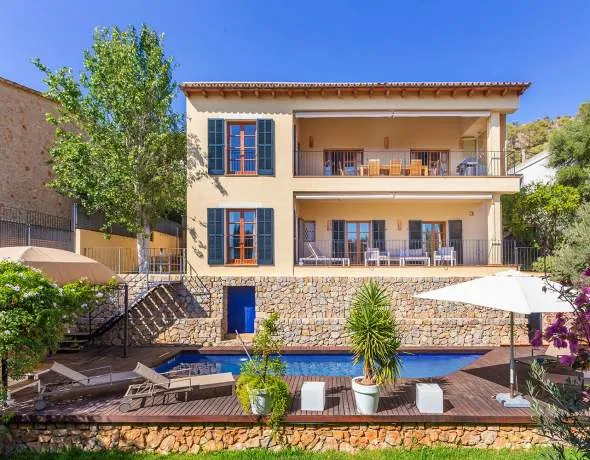 Esta villa mediterránea de dos plantas está situada en una codiciada zona residencial rural en las afueras de Calvià. Debido a la posición elevada de la propiedad, se puede disfrutar de una maravillosa vista panorámica sobre el pueblo hasta el mar. La ubicación ofrece una conexión central con el suroeste de la isla, con sus numerosos puertos, playas, campos de golf, etc., a pesar de la absoluta tranquilidad en un idilio rural – a la capital, Palma, se llega en unos 25 minutos en coche. La propiedad ofrece muy buenas zonas de terraza, una piscina de sal con terraza de madera, un jardín bien cuidado y zona de barbacoa. La zona de entrada en la planta superior comprende un salón-comedor con chimenea y acceso a la amplia terraza cubierta con fantásticas vistas, la cocina, la suite principal con baño y un aseo de invitados. El nivel inferior consta de tres dormitorios, dos baños (uno en suite), una gran terraza cubierta con hermosas vistas, una coladuria y un trastero. Además, hay una zona de sauna con habitaciones adicionales en el sótano en el nivel de la piscina, así como un garaje para dos coches.