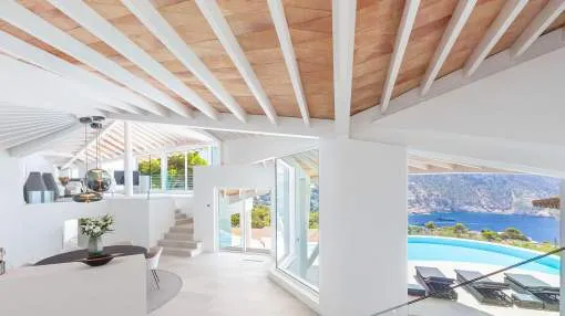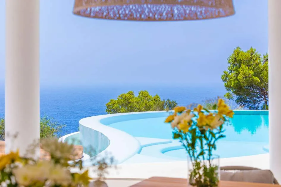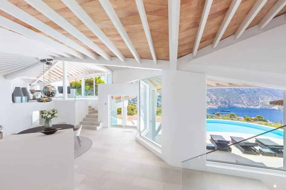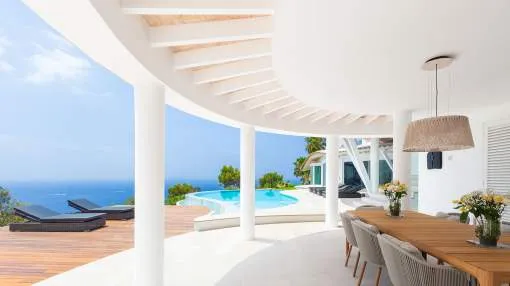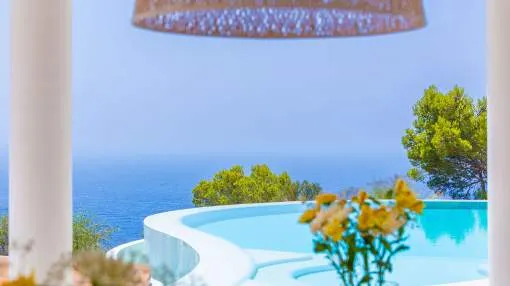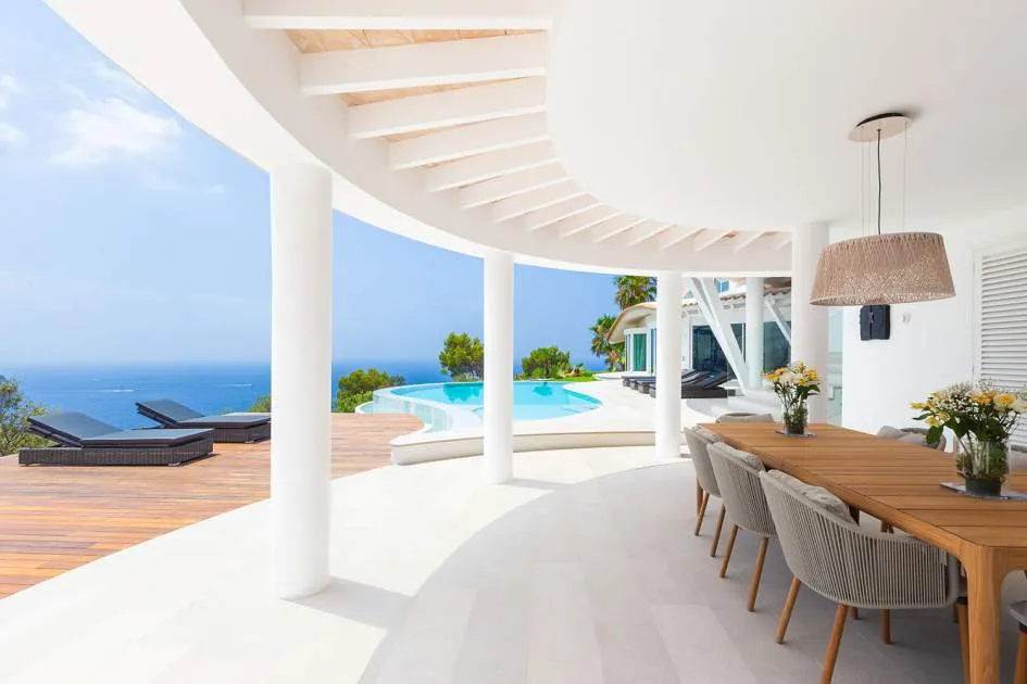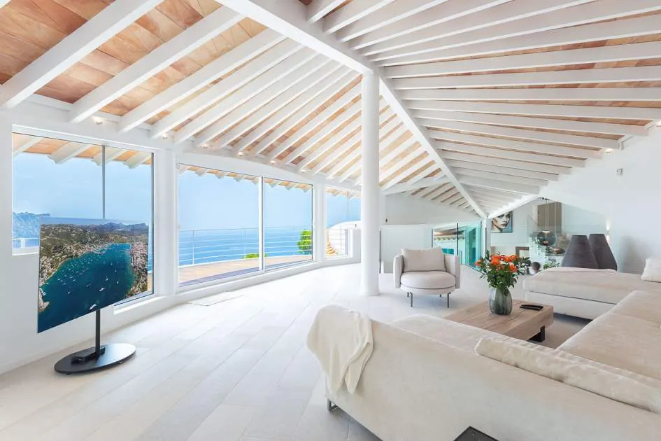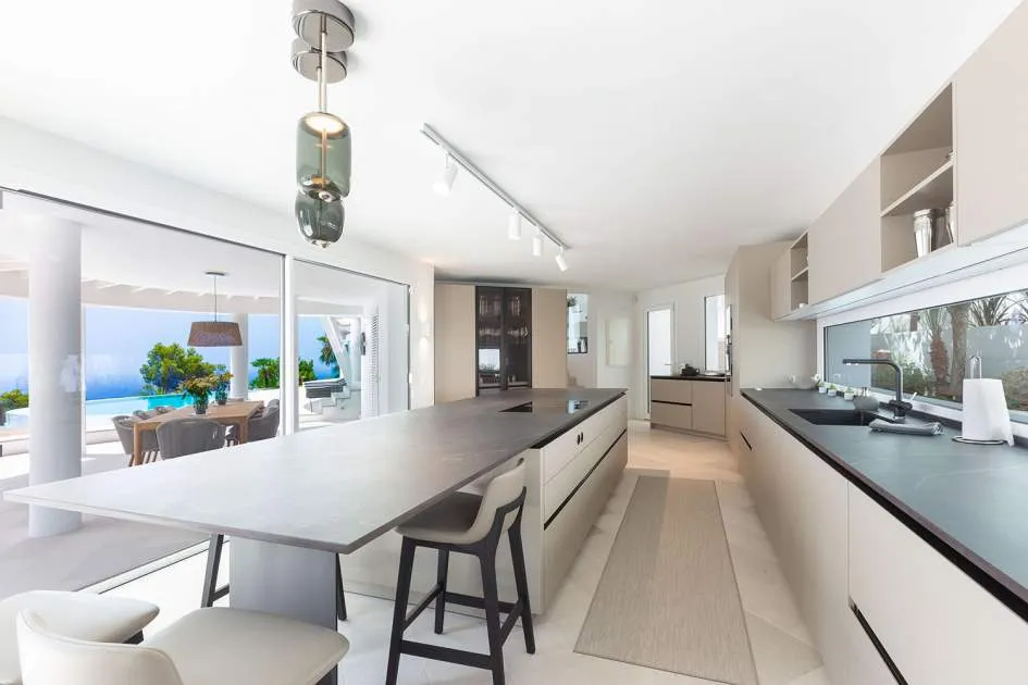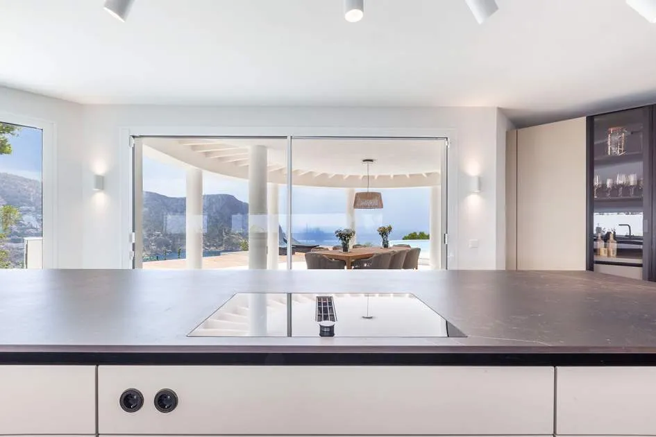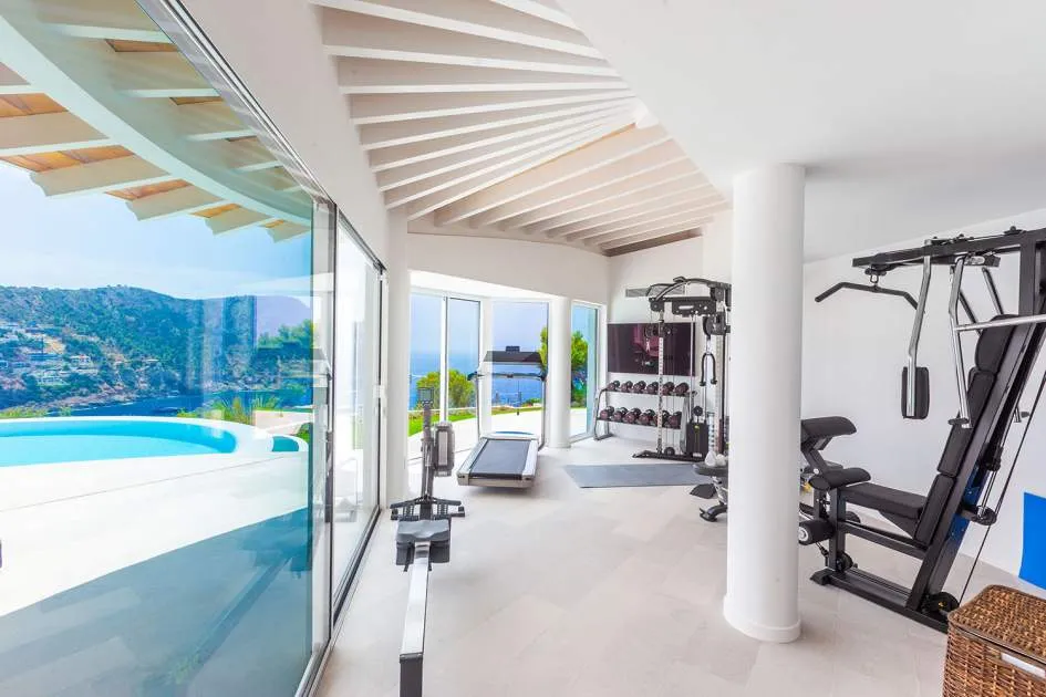 Esta extraordinaria villa de lujo es el proyecto del arquitecto sudamericano Alberto Rubio. Cautivan los tejados curvos con interesantes construcciones de vigas y la amplitud de las zonas interiores y exteriores. Las luminosas habitaciones con techos muy altos crean un ambiente único. Esta lujosa propiedad ofrece, en niveles escalonados, una impresionante y luminosa zona de estar con un salón, un comedor, una cocina moderna, dos amplios dormitorios con baños en suite, otros tres dormitorios con baños propios y una zona de gimnasio con fantásticas vistas a la piscina y al mar abierto. La villa encaja perfectamente en el terreno profusamente ajardinado y regado automáticamente en una ubicación privilegiada de la villa por encima de Cala Marmacén, ofreciendo sol todo el día y una fantástica vista de 180° al mar abierto. También cuenta con amplias terrazas cubiertas y descubiertas con una piscina infinita integrada, una zona de barbacoa con cocina de verano y un amplio garaje doble. La villa posee una licencia de alquiler vacacional y se sometió a una profunda renovación en 2023.