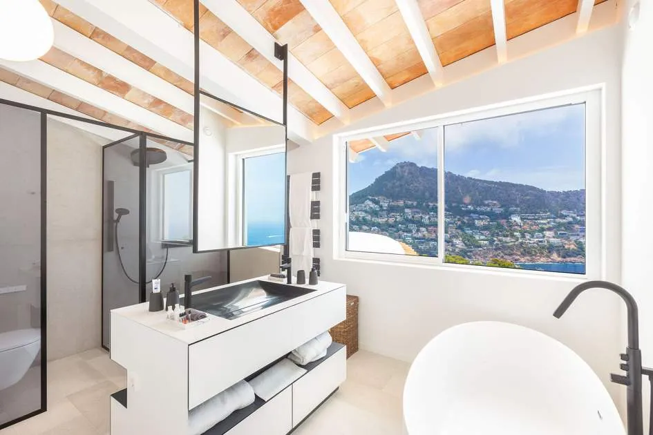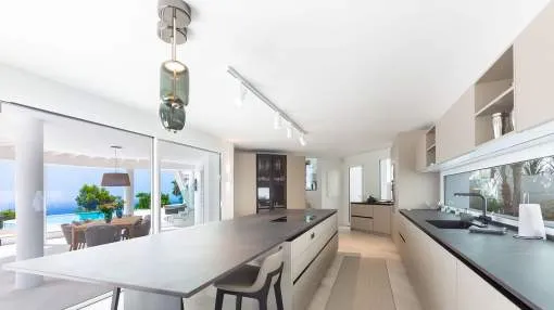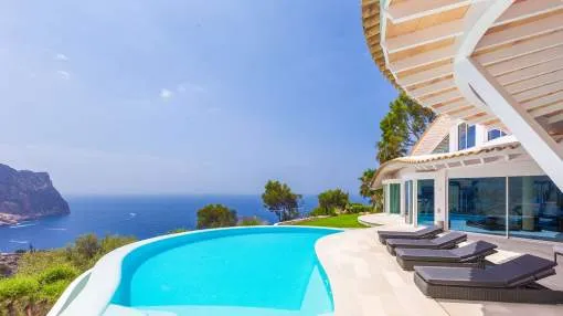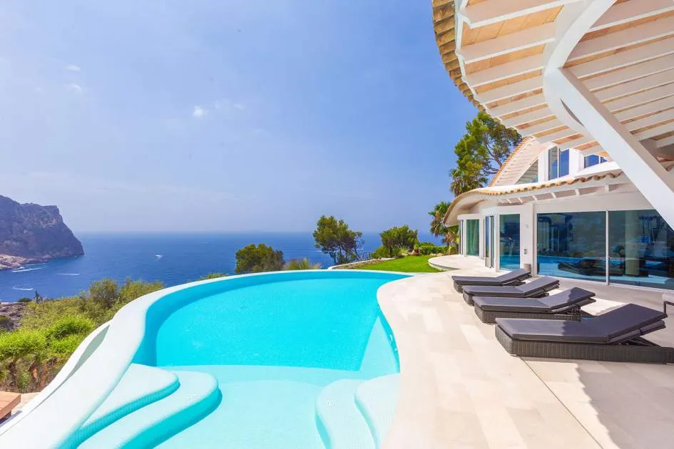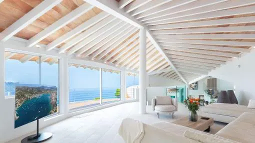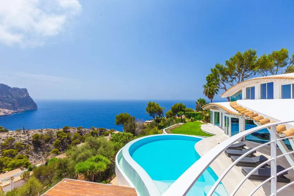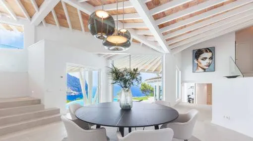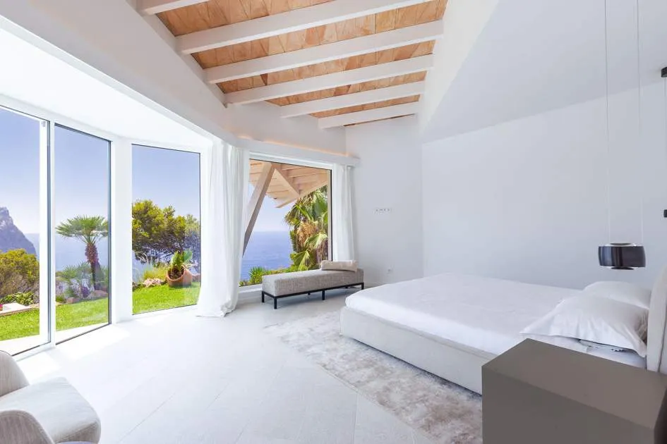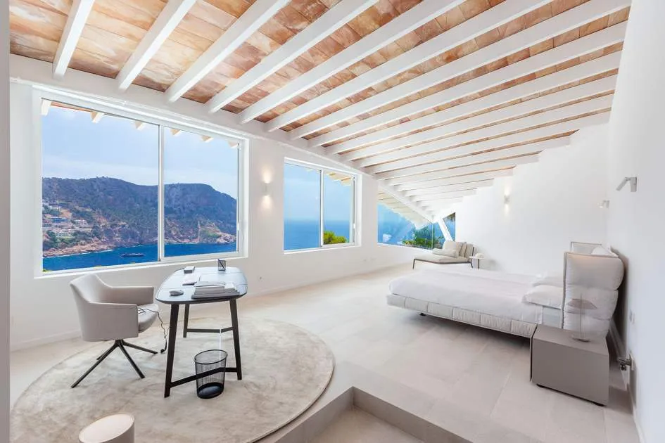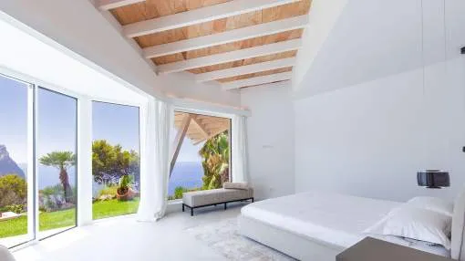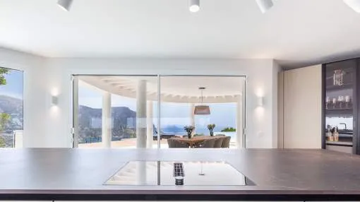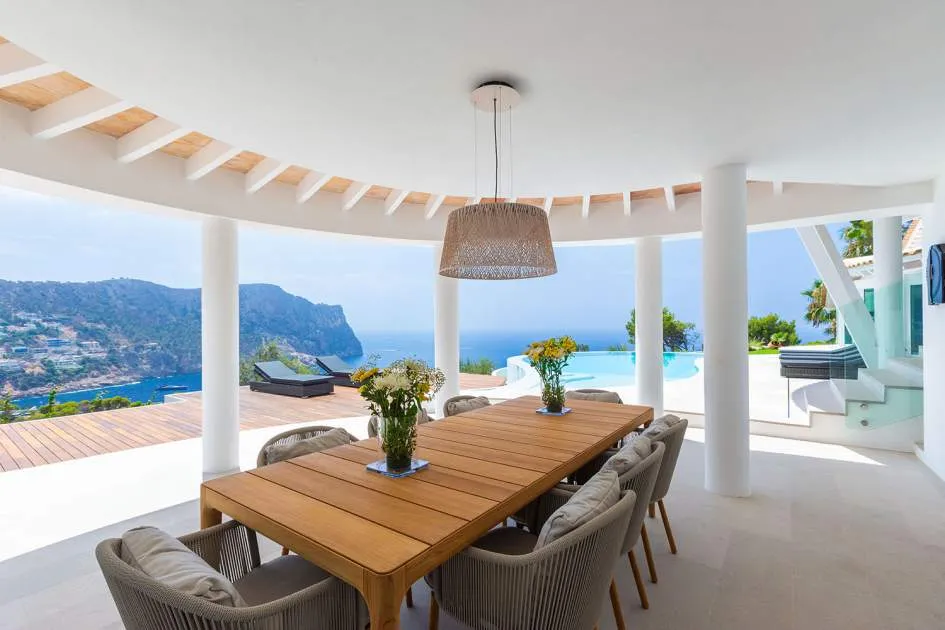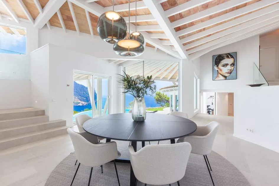 Esta extraordinaria villa de lujo es el proyecto del arquitecto sudamericano Alberto Rubio. Cautivan los tejados curvos con interesantes construcciones de vigas y la amplitud de las zonas interiores y exteriores. Las luminosas habitaciones con techos muy altos crean un ambiente único. Esta lujosa propiedad ofrece, en niveles escalonados, una impresionante y luminosa zona de estar con un salón, un comedor, una cocina moderna, dos amplios dormitorios con baños en suite, otros tres dormitorios con baños propios y una zona de gimnasio con fantásticas vistas a la piscina y al mar abierto. La villa encaja perfectamente en el terreno profusamente ajardinado y regado automáticamente en una ubicación privilegiada de la villa por encima de Cala Marmacén, ofreciendo sol todo el día y una fantástica vista de 180° al mar abierto. También cuenta con amplias terrazas cubiertas y descubiertas con una piscina infinita integrada, una zona de barbacoa con cocina de verano y un amplio garaje doble. La villa posee una licencia de alquiler vacacional y se sometió a una profunda renovación en 2023.