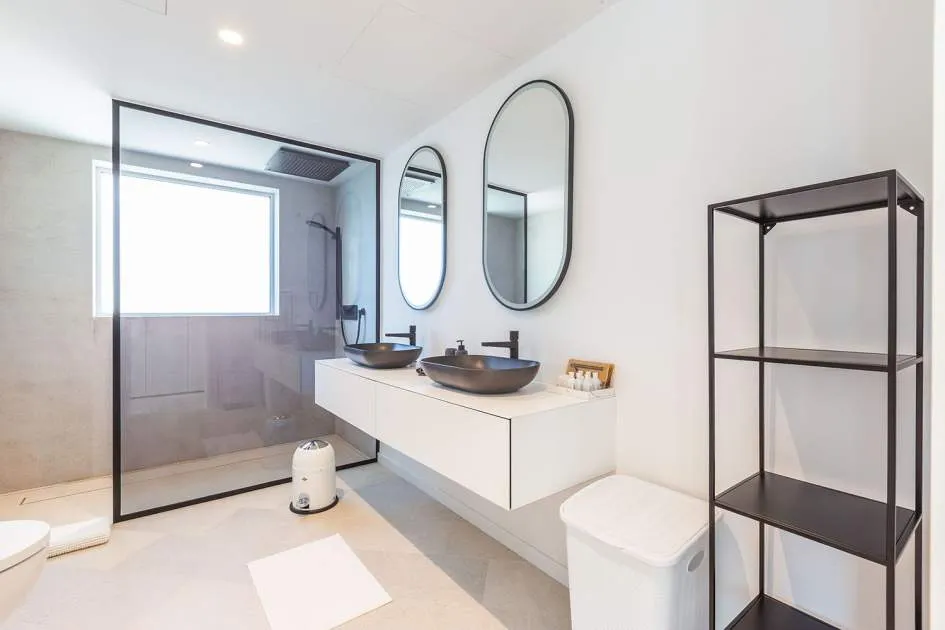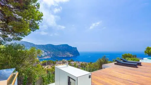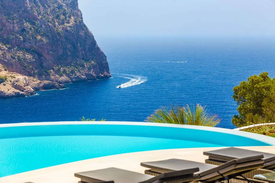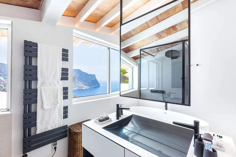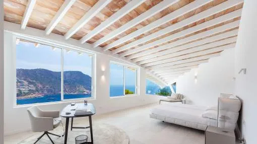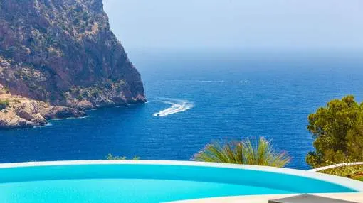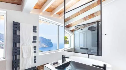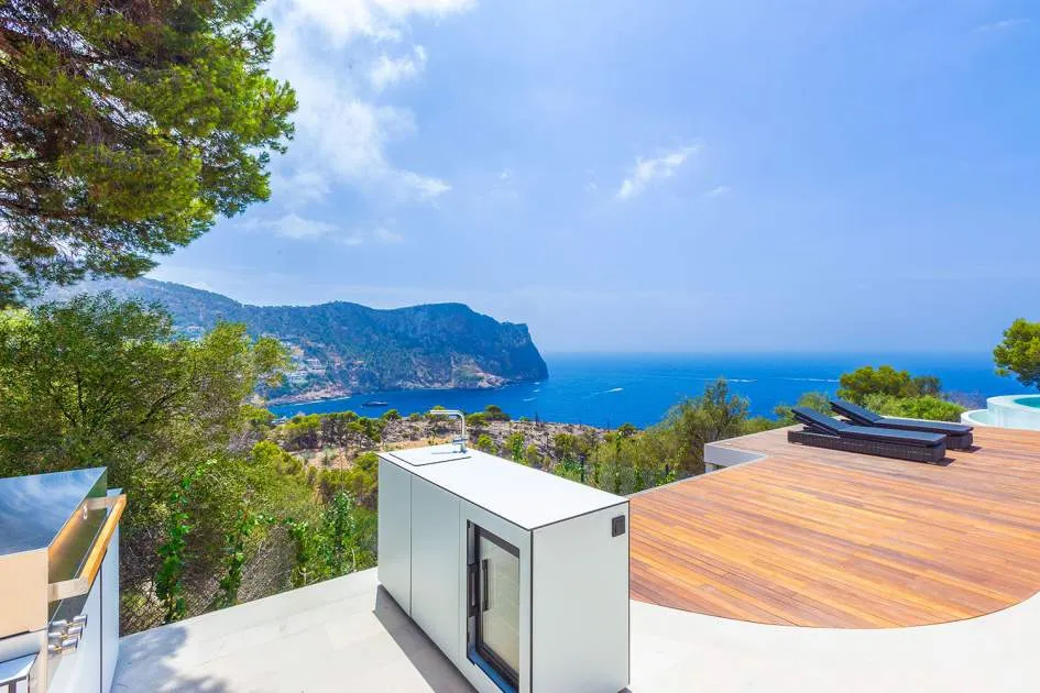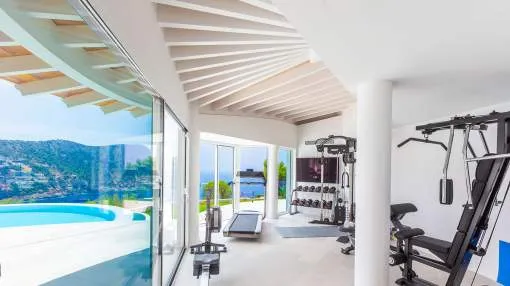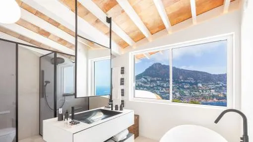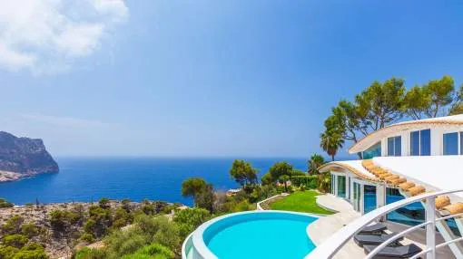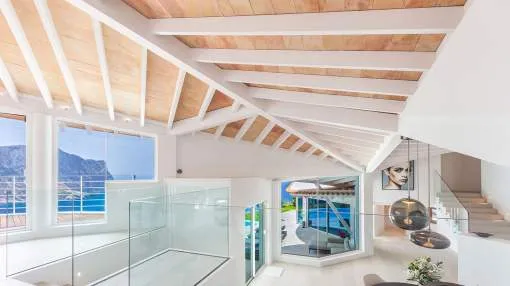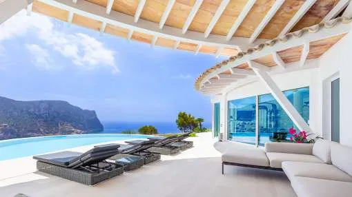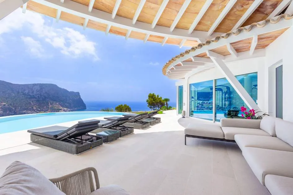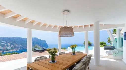 Esta extraordinaria villa de lujo es el proyecto del arquitecto sudamericano Alberto Rubio. Cautivan los tejados curvos con interesantes construcciones de vigas y la amplitud de las zonas interiores y exteriores. Las luminosas habitaciones con techos muy altos crean un ambiente único. Esta lujosa propiedad ofrece, en niveles escalonados, una impresionante y luminosa zona de estar con un salón, un comedor, una cocina moderna, dos amplios dormitorios con baños en suite, otros tres dormitorios con baños propios y una zona de gimnasio con fantásticas vistas a la piscina y al mar abierto. La villa encaja perfectamente en el terreno profusamente ajardinado y regado automáticamente en una ubicación privilegiada de la villa por encima de Cala Marmacén, ofreciendo sol todo el día y una fantástica vista de 180° al mar abierto. También cuenta con amplias terrazas cubiertas y descubiertas con una piscina infinita integrada, una zona de barbacoa con cocina de verano y un amplio garaje doble. La villa posee una licencia de alquiler vacacional y se sometió a una profunda renovación en 2023.