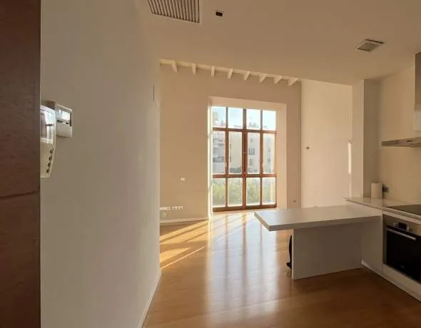 Este elegante estudio combina diseño contemporáneo, luz natural y ubicación privilegiada en una de las zonas más emblemáticas de la capital mallorquina. Con suelos de madera, techos altos con vigas vistas y grandes ventanales, cada rincón transmite amplitud y calidez a pesar de ser un espacio compacto.