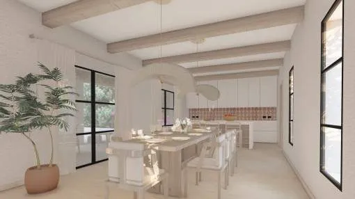 Descripción del inmueble: En las tranquilas afueras de Campos, en una amplia parcela de aprox. 14.131 m², se está construyendo una finca excepcional que combina arquitectura moderna, construcción sostenible y elegancia mediterránea al más alto nivel. Este proyecto está dirigido a compradores exigentes que valoran la privacidad, la calidad y el mantenimiento del valor a largo plazo. La residencia proyectada se extiende por el sótano, la planta baja y la planta superior y ofrece aproximadamente 210 m² de espacio habitable. Amplias terrazas, un porche cubierto, una elegante pérgola de aprox. 100 m² y una piscina de 35 m² crean un ambiente exclusivo para vivir relajadamente bajo el sol mallorquín. El concepto de las estancias impresiona por su apertura y claridad: una amplia zona de estar, comedor y cocina con acceso directo a la terraza constituye la pieza central de la casa. Tres cómodos dormitorios, tres cuartos de baño con equipamiento de alta calidad, un vestidor independiente y un garaje en el sótano garantizan el máximo confort. En la planta superior, una terraza adicional ofrece un refugio privado con vistas de gran alcance. Los amplios ventanales crean transiciones fluidas entre las zonas interiores y exteriores y permiten que la luz mediterránea se convierta en el elemento central del diseño. Con una superficie total de tan sólo 303 m², se mantiene un grado excepcional de amplitud y cercanía a la naturaleza. Esta finca de nueva construcción se caracteriza por su construcción sostenible y su excelencia técnica. Algunos aspectos destacados son: Paredes exteriores altamente aisladas en moderna construcción de sistema de madera con materiales de vida saludables y probados, ventanas de plástico con rotura de puente térmico triple acristalamiento aislante, ventilación controlada del espacio habitable con recuperación de calor, bomba de calor aire-agua de bajo consumo con calefacción por suelo radiante Una rara oportunidad de realizar una casa de alta calidad en armonía con la naturaleza - con calidad de construcción alemana y estilo de vida mallorquín. Lugar & alrededores: La ciudad rural de Campos, en el sureste de la isla, está situada a medio camino entre Llucmajor y Santanyí sin problemas de tráfico. Rodeada de extensas superficies agrícolas, ofrece muchos comercios para las necesidades diarias, restaurantes e instalaciones deportivas. De aquella ciudad de la Edad Media quedan actualmente sólo algunas torres, pues hoy en día Campos es una pequeña ciudad llena de vida que atrae numerosos visitantes especialmente en los días de mercado. La famosa y larga playa de arena de Es Trenc con sus dunas y aguas color turquesa pertenece al municipio de Campos y ofrece diversión playera con un toque caribeño. Al aeropuerto se llega en 25 minutos, la capital de la isla de Palma está a unos 35 km.