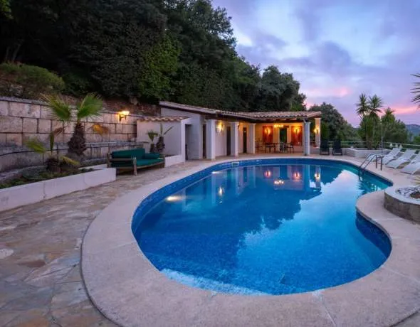 Esta impresionante finca mallorquina, situada en lo alto de las montañas, ofrece un refugio único de privacidad y serenidad, rodeada de bosque y naturaleza, con unas vistas inigualables a Palma y sus alrededores. Combina a la perfección el encanto tradicional de las casas mallorquinas con las comodidades modernas, creando un hogar lleno de carácter y confort.