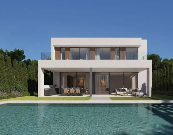 La propiedad se distribuye en tres niveles e destaca por su arquitectura clara y contemporánea con elegantes fachadas y amplios ventanales. En el interior se está creando un concepto de vivienda abierto y lleno de luz, en el que las zonas de salón, comedor y cocina fluyen armoniosamente entre sí. Una cocina de diseño con electrodomésticos de marca se integra perfectamente en el conjunto moderno y cumple con los más altos estándares de funcionalidad y estética. Materiales de máxima calidad como suelos de piedra natural y suelos de parquet subrayan el carácter lujoso y crean un ambiente agradable. Grandes puertas correderas conectan de forma fluida el salón con la terraza cubierta y el jardín con piscina de agua salada.