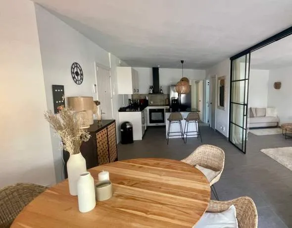 El apartamento cuenta con 2 dormitorios decorados con gusto, uno de ellos flexible para usarse como extensión del salón con un sofá cama – ideal para invitados o espacio adicional.