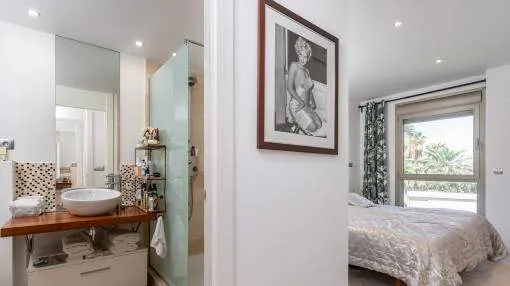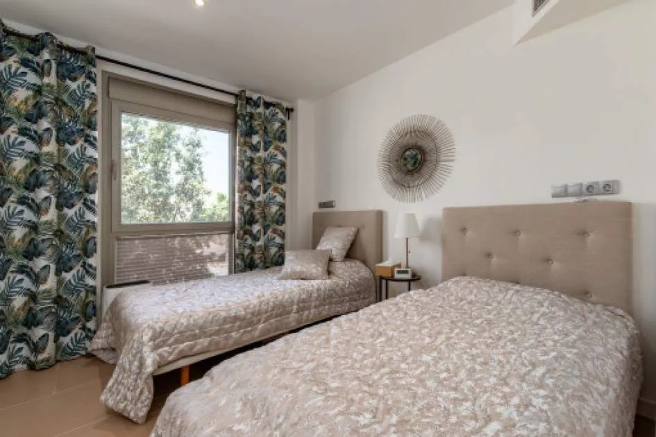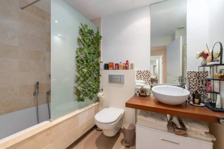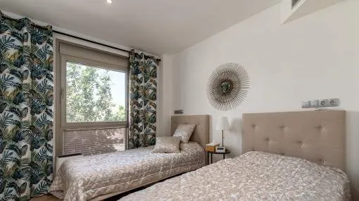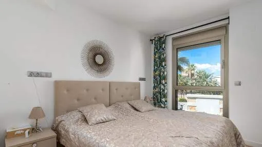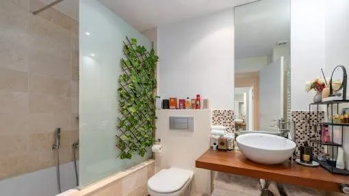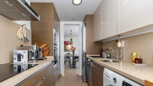El salón-comedor de planta abierta transmite una sensación de luminosidad y ofrece acceso directo a la terraza. La cocina independiente está totalmente equipada. Dos cómodos dormitorios y 2 modernos cuartos de baño, uno de ellos en suite, ofrecen mucho espacio y privacidad. El aire acondicionado y la calefacción por infrarrojos garantizan un agradable clima interior en todas las habitaciones en cualquier época del año. El piso también dispone de un sistema de ósmosis para la producción de agua potable, así como de una plaza de aparcamiento subterráneo y una bodega.