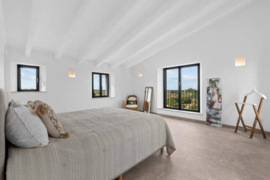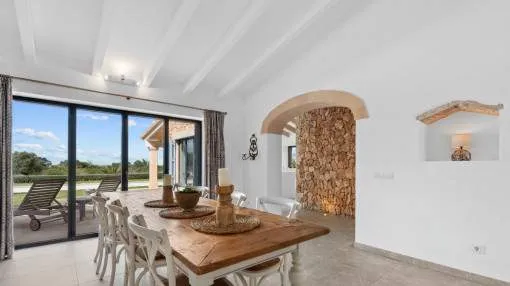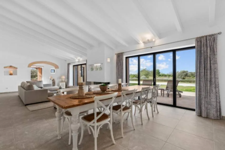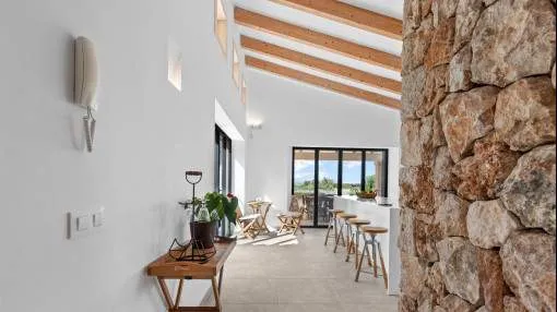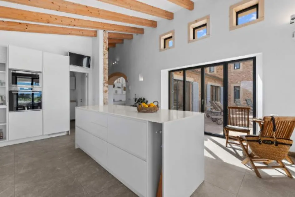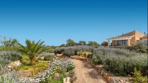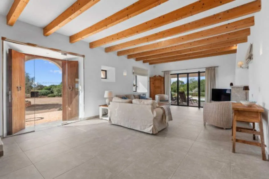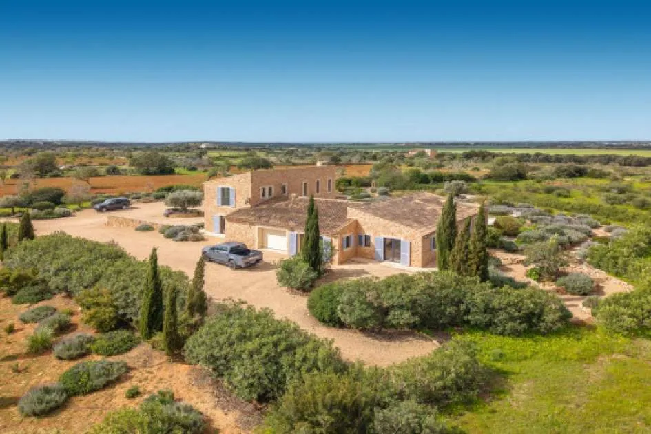 Descripción del inmueble: Esta encantadora finca de piedra natural está situada en una amplia parcela de unos 14.200 metros cuadrados y combina el encanto mediterráneo con el confort de la vida moderna. Rodeada de naturaleza virgen, podrá disfrutar de impresionantes vistas panorámicas de 360 grados gracias a los ventanales que van del suelo al techo: un lugar donde la paz y el espacio son tangibles. El idílico pueblo de Ses Salines está a sólo unos minutos. En la planta baja, le da la bienvenida un amplio y luminoso salón con chimenea, que proporciona un calor acogedor en las noches más frías. La moderna cocina abierta se integra armoniosamente en el comedor contiguo. Varias salidas conducen a terrazas cuidadosamente diseñadas con acogedoras zonas de estar. Aquí podrá disfrutar de espectaculares puestas de sol al atardecer. Dos acogedores dormitorios, cada uno con su propio cuarto de baño, completan esta planta. En la planta superior le espera el elegante dormitorio principal con baño en suite, vestidor y magníficas vistas al mar y a Cabrera. Otro dormitorio con baño en suite completa el espacio en este nivel. El jardín de estilo mediterráneo y bajo mantenimiento invita a la relajación. Destacan la piscina de 20 metros de largo y la zona de barbacoa cubierta independiente con chimenea. La oferta se completa con un amplio garaje para 2 vehículos con acceso directo a la casa, así como calefacción por suelo radiante, que garantiza un ambiente agradable incluso en los meses más fríos del año. Lugar & alrededores: Ses Salines es uno de los pueblos más bonitos y antiguos en la costa sureste de Mallorca. La imagen del pueblo se caracteriza por los agradables bares y restaurantes donde mallorquines y turistas toman su café con leche al disfrutar del sol. Es un pueblo típico mallorquín que recibe su nombre de las salinas del tiempo romano. Hasta la fecha se cosecha sal de ellas. Los talayotes, vestigios de un asentamiento prehistórico, también son muy interesantes. Muchas calas pequeñas como la de Cala Llombards y la playas natural de Es Trenc están a pocos minutos en coche. También puede descubrir el paisaje precioso y plano con la bicicleta.