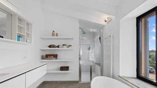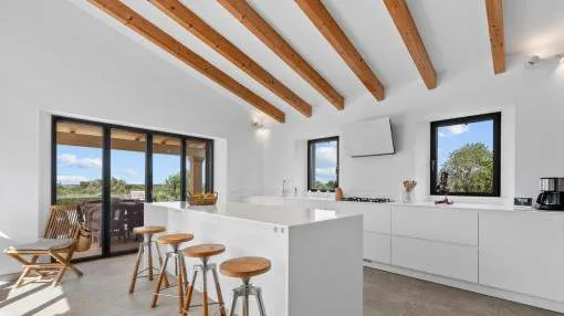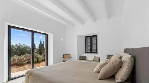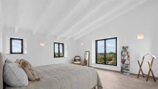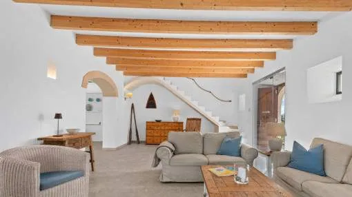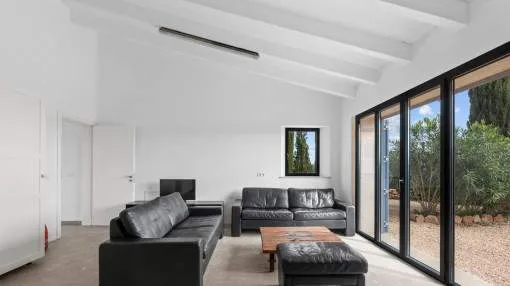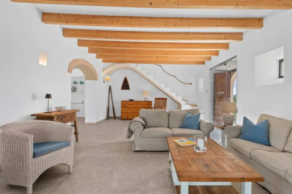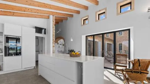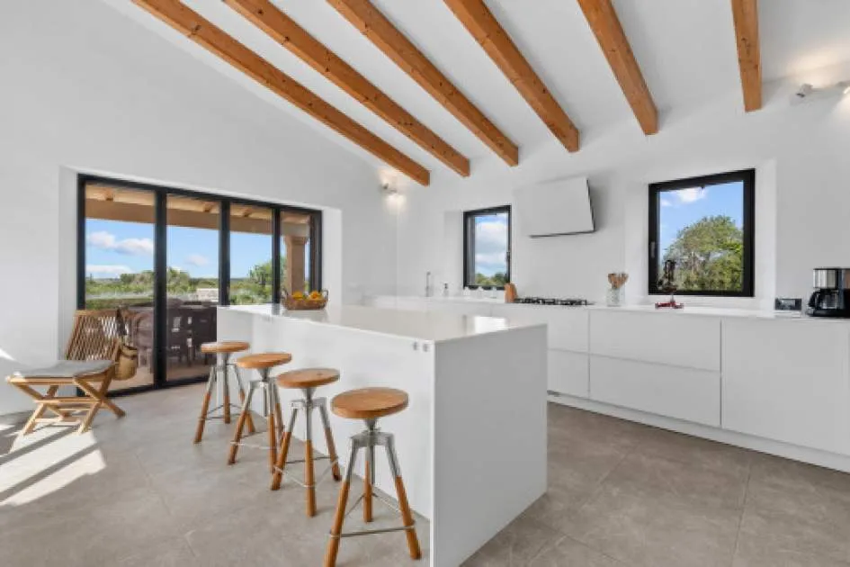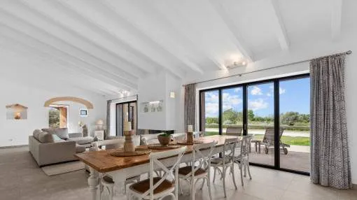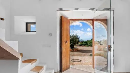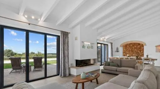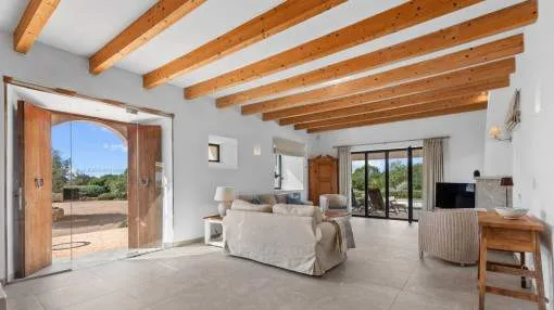 Descripción del inmueble: Esta encantadora finca de piedra natural está situada en una amplia parcela de unos 14.200 metros cuadrados y combina el encanto mediterráneo con el confort de la vida moderna. Rodeada de naturaleza virgen, podrá disfrutar de impresionantes vistas panorámicas de 360 grados gracias a los ventanales que van del suelo al techo: un lugar donde la paz y el espacio son tangibles. El idílico pueblo de Ses Salines está a sólo unos minutos. En la planta baja, le da la bienvenida un amplio y luminoso salón con chimenea, que proporciona un calor acogedor en las noches más frías. La moderna cocina abierta se integra armoniosamente en el comedor contiguo. Varias salidas conducen a terrazas cuidadosamente diseñadas con acogedoras zonas de estar. Aquí podrá disfrutar de espectaculares puestas de sol al atardecer. Dos acogedores dormitorios, cada uno con su propio cuarto de baño, completan esta planta. En la planta superior le espera el elegante dormitorio principal con baño en suite, vestidor y magníficas vistas al mar y a Cabrera. Otro dormitorio con baño en suite completa el espacio en este nivel. El jardín de estilo mediterráneo y bajo mantenimiento invita a la relajación. Destacan la piscina de 20 metros de largo y la zona de barbacoa cubierta independiente con chimenea. La oferta se completa con un amplio garaje para 2 vehículos con acceso directo a la casa, así como calefacción por suelo radiante, que garantiza un ambiente agradable incluso en los meses más fríos del año. Lugar & alrededores: Ses Salines es uno de los pueblos más bonitos y antiguos en la costa sureste de Mallorca. La imagen del pueblo se caracteriza por los agradables bares y restaurantes donde mallorquines y turistas toman su café con leche al disfrutar del sol. Es un pueblo típico mallorquín que recibe su nombre de las salinas del tiempo romano. Hasta la fecha se cosecha sal de ellas. Los talayotes, vestigios de un asentamiento prehistórico, también son muy interesantes. Muchas calas pequeñas como la de Cala Llombards y la playas natural de Es Trenc están a pocos minutos en coche. También puede descubrir el paisaje precioso y plano con la bicicleta.