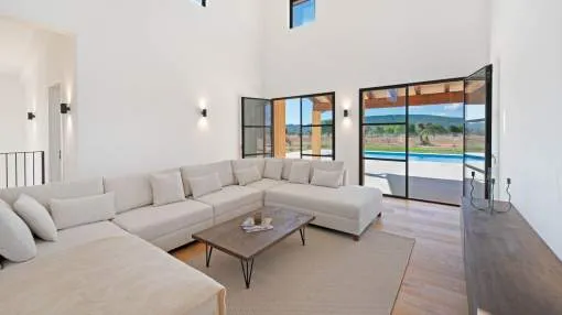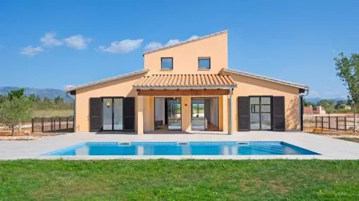 La finca ofrece un espacio de vida amplio y cómodo, con una sala de estar de concepto abierto y una cocina de diseño totalmente equipada con frigorífico doble, congelador, horno y cocina de inducción. Cuatro dormitorios en suite proporcionan privacidad y elegancia, mientras que la planta inferior ofrece potencial para una bodega o la instalación de un área de fitness, spa y bienestar. Una piscina de agua salada con terrazas acogedoras crea un oasis de relajación, garantizando comodidad y total privacidad.