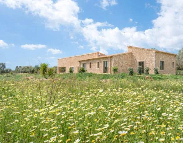 Finca de nueva construcción con fachada de piedra natural y piscina en una ubicación tranquila entre Campos y Es Trenc