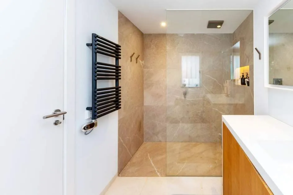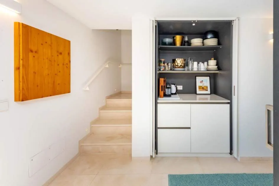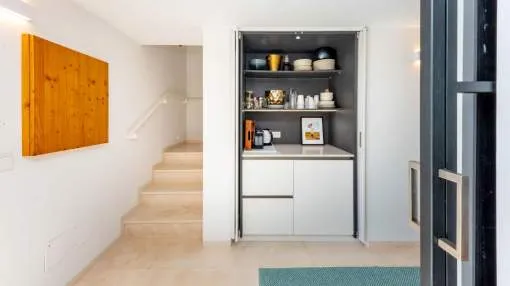 La planta superior ofrece acceso al balcón con bonitas vistas al puerto. La cocina moderna, equipada con elementos de madera y piedra, es funcional y de buen gusto, con un comedor adyacente. En total, la propiedad cuenta con 3 dormitorios y 3 baños, incluido un dormitorio principal con baño en suite.