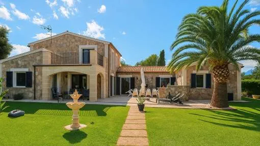 Descripción del inmueble: Esta propiedad excepcional cerca de Santanyi es un escondite en medio de la naturaleza cerca de Santanyi. Cuando se abre la puerta automática, se entra en la propiedad a través de un camino de entrada bellamente plantado. Aquí se sentirá inmediatamente conectado con la naturaleza. Al llegar a la casa, una hermosa zona de entrada le invita a entrar en esta finca. En la planta baja hay un amplio salón-comedor con una chimenea de diseño excepcional. Aquí es donde la familia puede reunirse para las comidas o para pasar horas acogedoras junto a la chimenea. A la izquierda de esta zona se encuentra la cocina independiente, que no deja nada que desear y también ofrece acceso a una cocina exterior. La planta baja también ofrece un acogedor rincón de TV, 1 dormitorio y un cuarto de ducha. Una escalera conduce a la planta superior. Aquí se encuentra el dormitorio principal con vestidor y acceso a un balcón y otro dormitorio, también con acceso a un balcón. En el centro de la planta superior se encuentra un cuarto de baño fantásticamente grande, un templo del bienestar. Una bañera de diseño es lo más destacado de este baño único. Desde la planta baja se accede a un hermoso jardín con una fantástica zona de piscina y una terraza cubierta. En todas partes hay oportunidades para el retiro privado. A la izquierda hay un encantador estanque koi. Hay otro estanque con una preciosa casita a la que se accede a través de una pasarela. Pequeños juegos de agua y una gran variedad de libélulas invitan a quedarse. Aquí podrá olvidarse del estrés del día. La finca tiene un sótano completo y se utiliza actualmente como un dormitorio adicional. Aquí se podría instalar un amplio GYM y/o una sauna. Otro punto a destacar es la piscina cubierta frente a la entrada principal. Otras características incluyen: Calefacción por suelo radiante, solar, aire acondicionado y mucho más. Lugar & alrededores: Las playas de Cala Mondragó y Cala Figuera están justo al lado de la bahía más conocida de Cala Llombards, en el sureste de la isla. La playa de arena blanca y fina de S'Amarador, en Cala Mondrago, es muy natural, ya que linda con una reserva natural. El agua cristalina y turquesa invita a nadar. Las localidades de Cala d'Or, Portopetro y Santanyí están a poca distancia.
