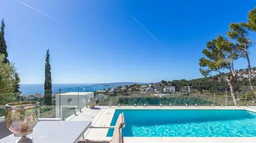 Se llama Orange blue, una villa en primera línea con impresionantes vistas al mar, situada en un terreno de 792 m2 cerca de la marina de Port Adriano. La propiedad de 4 dormitorios y 4 baños ofrece una superficie construida de 350 m2. La villa bañada en luz, se ha construido pensando en el concepto de espacio abierto, y es descrita en 4 palabras, una obra maestra arquitectónica. Desde todas las habitaciones se pueden disfrutar de las vistas al Mediterráneo abierto y de fantásticas puestas de sol. En la zona exterior hay magnífica piscina infinita y extensas terrazas que invitan para tomar el sol. La villa ha sido completamente renovada y está en perfectas condiciones. Características adicionales son: aire acondicionado frío/calor, garaje con acceso directo a la casa, sistema de sonido.