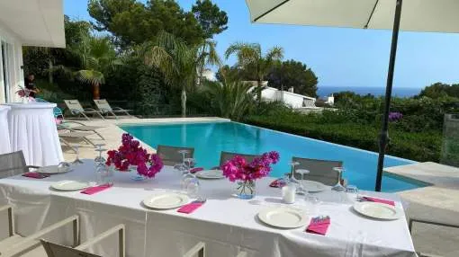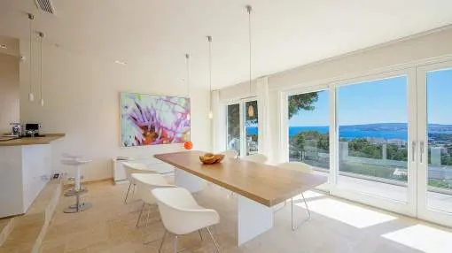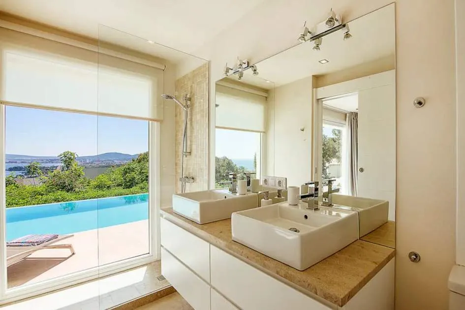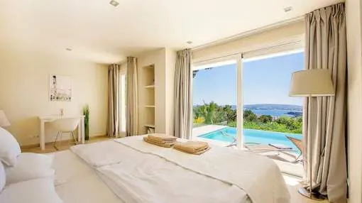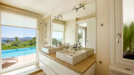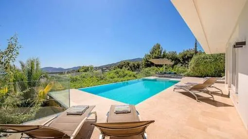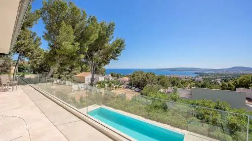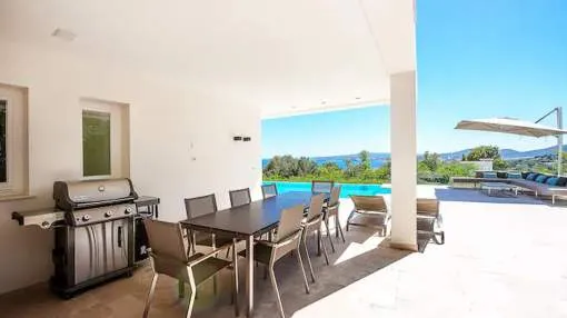 Villa moderna, luminosa y muy amplia, en uno de los lugares más codiciados de Mallorca. La villa tiene una gran terraza con piscina y una terraza cubierta con cocina exterior + barbacoa Weber. Todas las habitaciones tienen calefacción de suelo radiante y aire acondicionado. Acceso a Internet de alta velocidad, WLAN y radio Sonos / sistema de música.