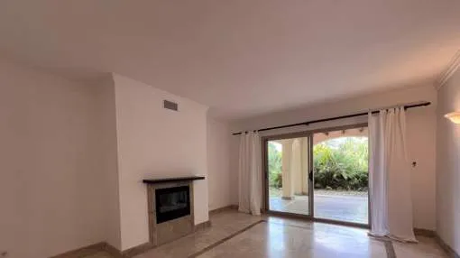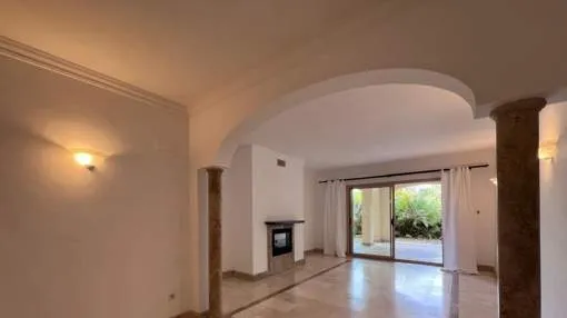Elegante apartamento en planta baja en un complejo residencial de alto standing al lado de campos de golf en Nova Santa Ponsa, suroeste de Mallorca. Comunidad cuenta con sólo 42 apartamentos en 3 edificios que permite llamarla un oasis de paz y tranquilidad. Los residentes y sus huéspedes se benefician del amplio territorio vallado que ofrece una piscina tipo lago, rodeada de bellos jardines tropicales.