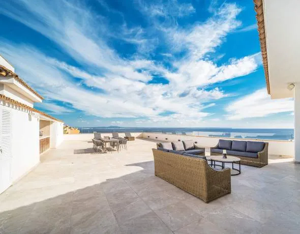 Este extraordinario ático, renovado con materiales de alta calidad, se encuentra en la exclusiva zona residencial de Illetas, a solo unos pasos de la playa. Situado en segunda línea de mar, disfruta de unas magníficas vistas panorámicas al mar y la costa. Tiendas, restaurantes y bares se encuentran a poca distancia a pie, y Puerto Portals, igual que el campo de golf real de Bendinat, están a solo unos minutos en coche.