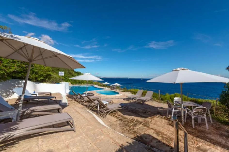 Luminoso apartamento en planta baja con amplia terraza soleada, piscina comunitaria en primera línea de mar y acceso directo al mar en Cala Vinyas