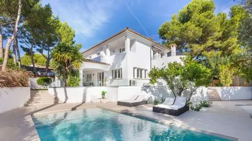 Encantadora villa de estilo mediterráneo con vistas panorámicas al puerto de Andratx, piscina infinita y cinco amplias habitaciones dobles.