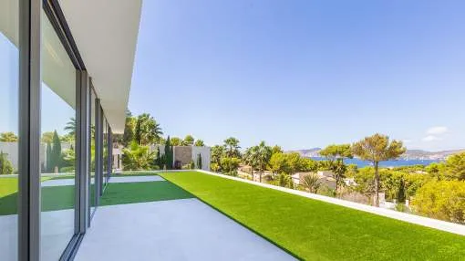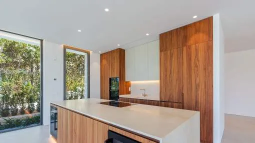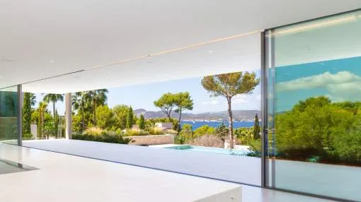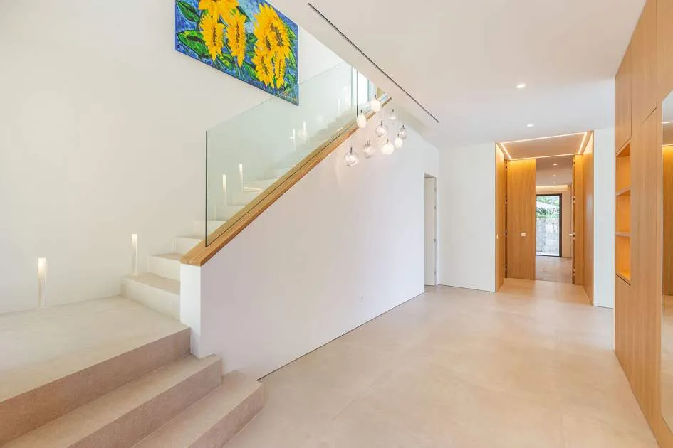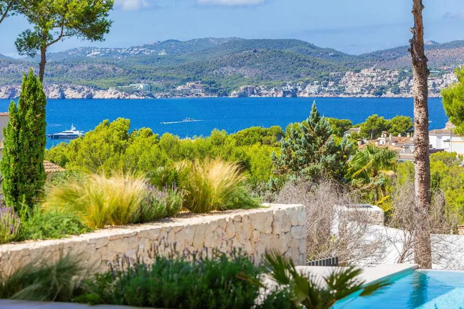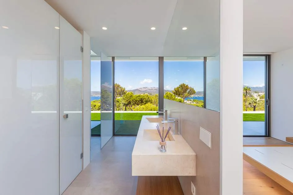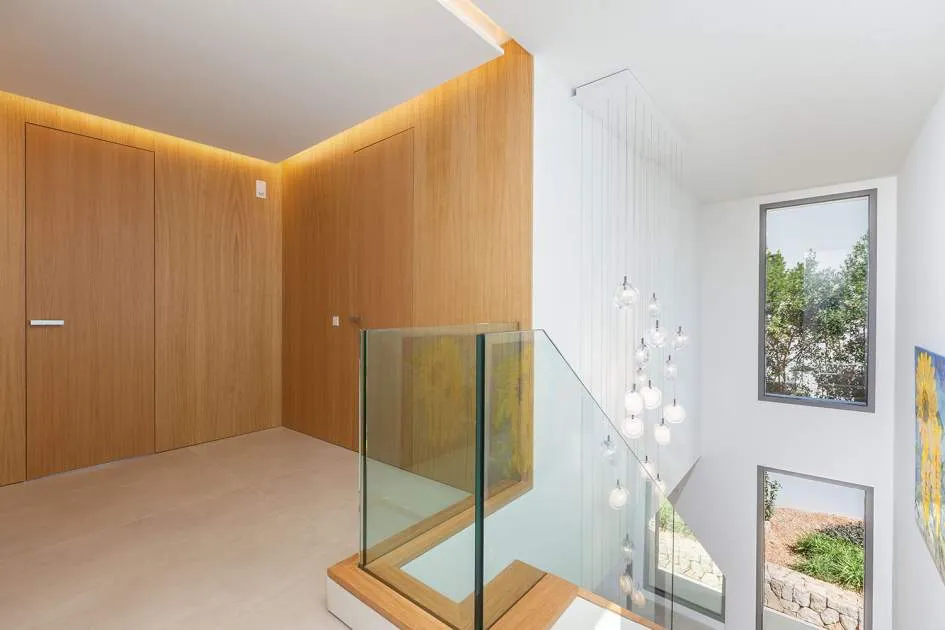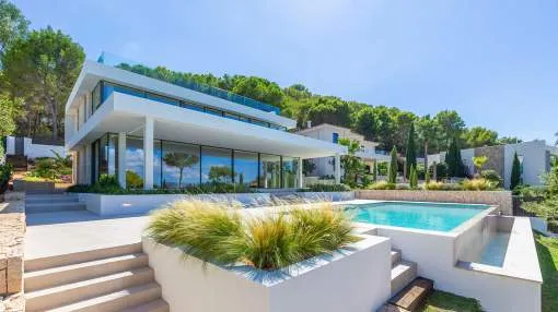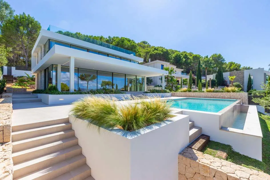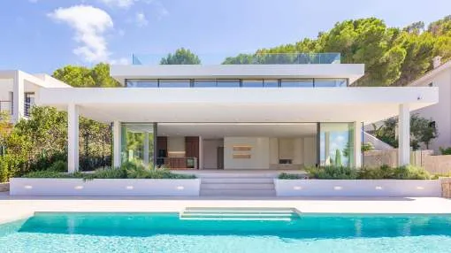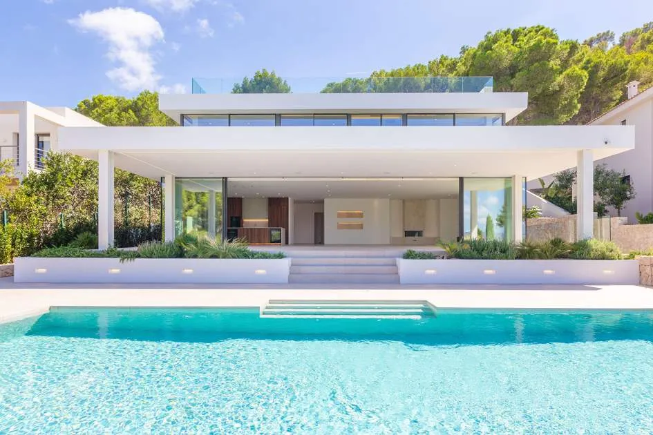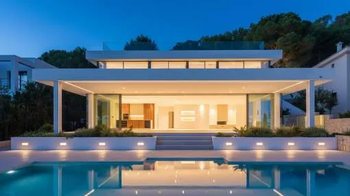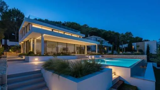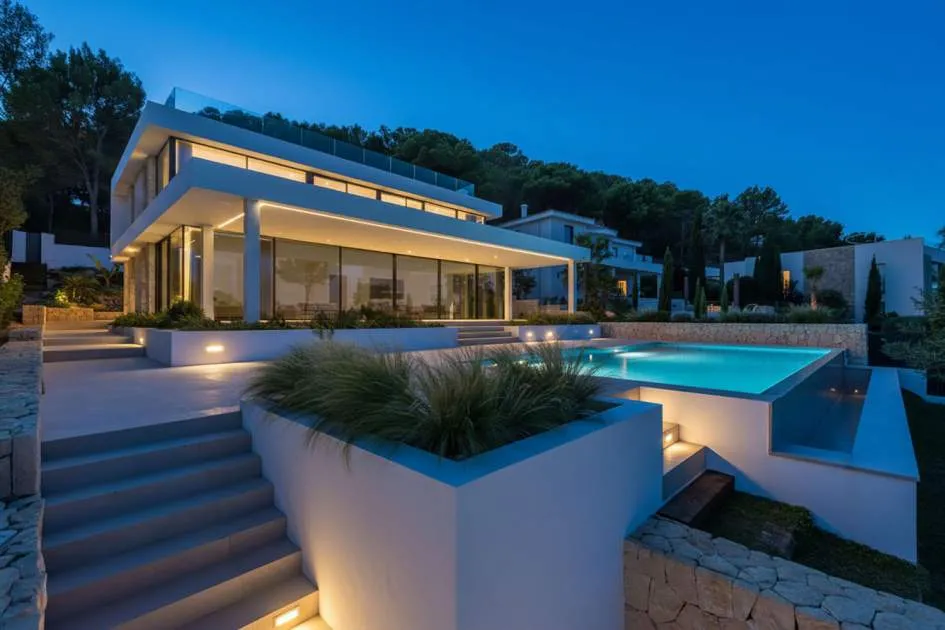 Situada en una de las urbanizaciones más exclusivas de Santa Ponsa, esta elegante villa de nueva construcción se presenta como un moderno refugio con absoluta privacidad. La tranquila zona residencial limita directamente con una extensa área protegida, accesible a través de una puerta de jardín autorizada. Al mismo tiempo, la ubicación convence por su cercanía al centro: tres prestigiosos campos de golf y varios puertos deportivos se encuentran en las inmediaciones. La amplia playa de arena de Santa Ponsa, calas idílicas, instalaciones deportivas y de ocio, así como numerosas opciones de compras y restauración, están a pocos minutos en coche.