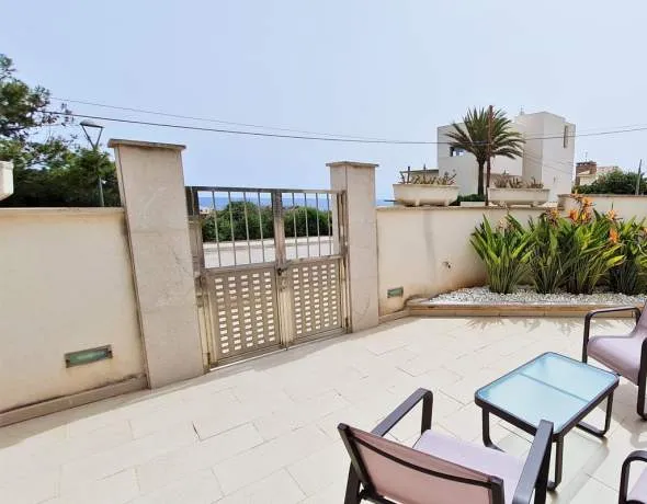 El apartamento es una planta baja y cuenta con 3 amplios y luminosos dormitorios, 2 baños, un amplio y luminoso salón con vistas al mar, una cocina totalmente equipada y una coladuría. Además, el apartamento cuenta con una gran terraza que ofrece unas bonitas vistas al mar. En la terraza hay una mesa y una barbacoa para disfrutar de las maravillosas noches de verano mediterráneo.