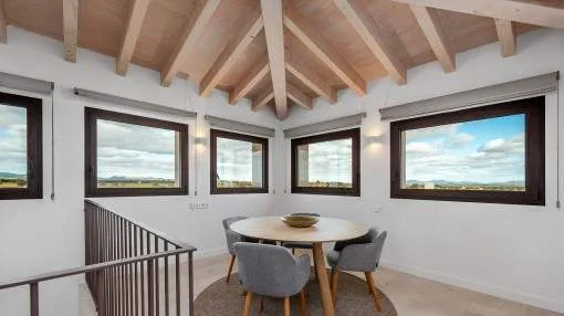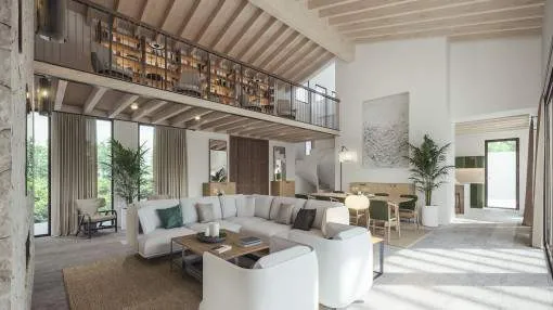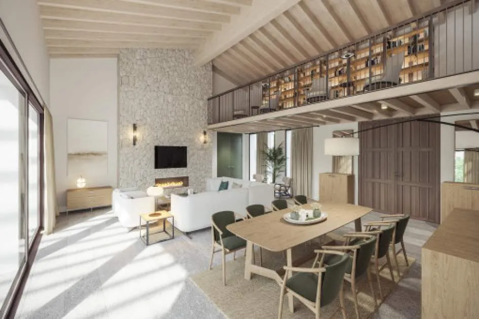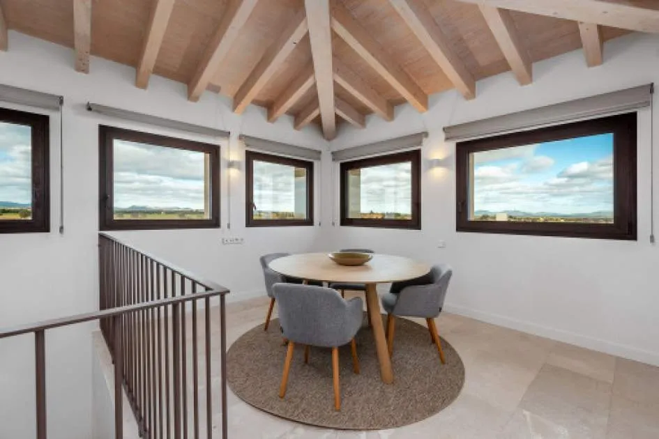 Details: This exclusive new-build finca is situated in a privileged location, just a few minutes from the beautiful natural beach of Es Trenc, nestled in the Mediterranean landscape between Campos and Sa Rápita. Six Mallorcan-style country estates form a high-quality residential complex with a special focus on privacy and quality. There are currently 2 houses available, each with approx. 575 sqm of living space, which can be rented furnished or unfurnished. Each property has a private plot of approx. 100,000 sqm, a spacious saltwater pool (approx. 75 sqm), a pool house and a large garage. The finca offers a spacious living and dining area with gallery and stylish library. There are a total of 4 bedrooms, 4 bathrooms en suite and a guest WC. The fully equipped kitchen with cooking island is located at the rear of the dining room on the first floor. Large sliding glass doors provide light-flooded rooms and direct access to the terrace. In the right wing there are 4 spacious double bedrooms with en-suite bathrooms and fitted wardrobes. All bedrooms have direct access to the garden. The separate outbuilding comprises a double garage, a storage room, a pantry and a bathroom with access from the pool area. The covered terrace offers pleasant shade in summer and an inviting barbecue area. The finca has central air conditioning, underfloor heating and a modern aerothermal system (air heat pump) for efficient heating and cooling. High-quality furnishings, modern home technology and a fully equipped kitchen round off this offer. The furniture shown in the photos may differ from the final furnishings. All consumption costs as well as the costs for garden and pool maintenance are to be borne by the tenant. Further units of this project: referenceconstructed areabedroomsfloorprice119506F575 m²40on request 119506G575 m²40on request Location & surrounding area: Directly at the marina of Sa Rápita, on the south coast, you find the dreamlike large sandy beach of Es Trenc, one of the most beautiful beaches of the island. The calm village is mainly popular among sailors and families. Especially small holiday houses are lined up along the steep coast. The village has a small supermarket, a bank, a bakery and a kiosk for the everyday needs. The village of Campos with large supermarkets and a weekly market is a short drive away. The best ice cream in Mallorca and several restaurants with sea views are found along the coastal road inviting cyclists, residents and tourists to stop for a bite to eat. Sa Rápita is only an approx. 25-minute drive away from the airport.