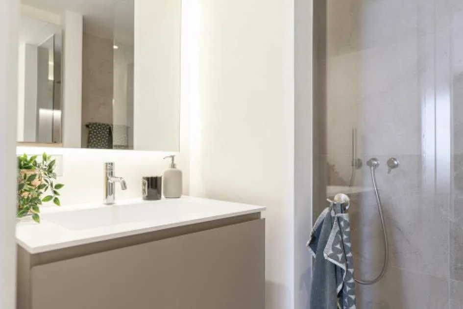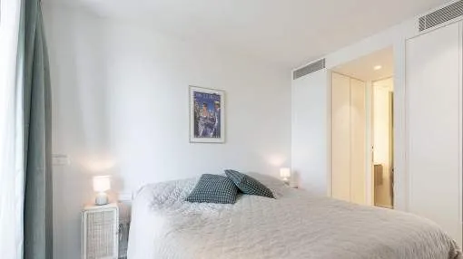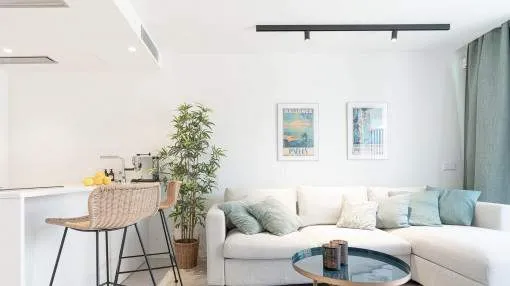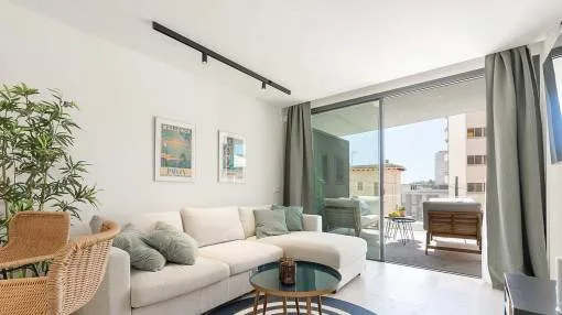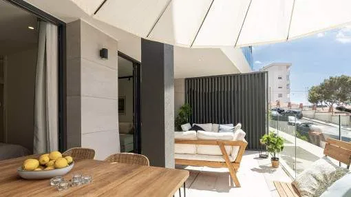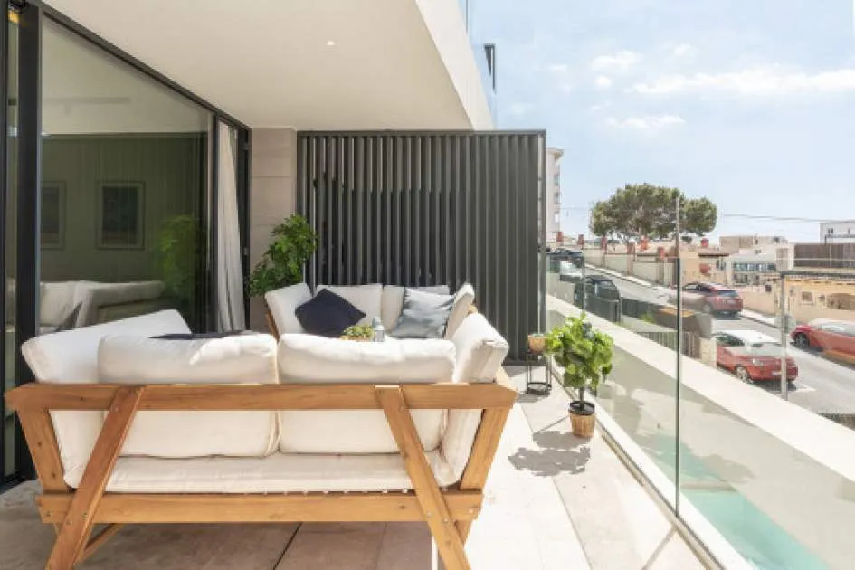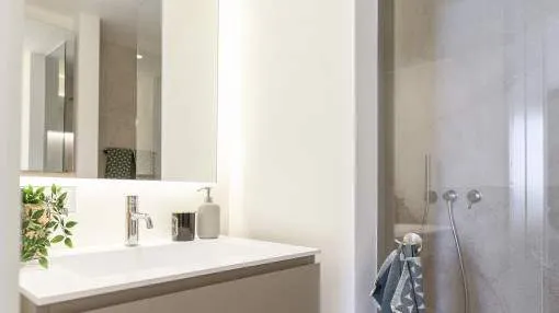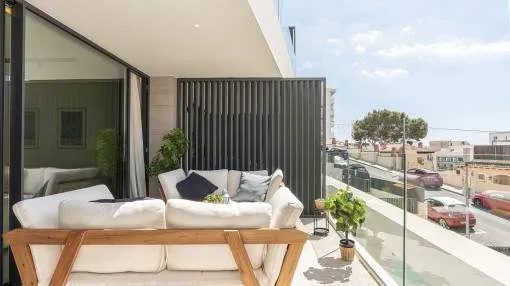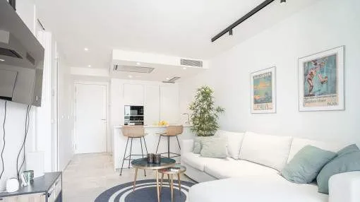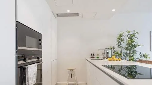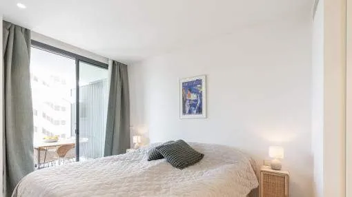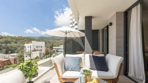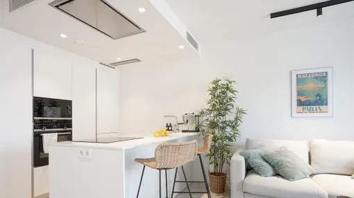 Details: This stylish and light-filled apartment is located on the second floor of a high-quality new development completed in 2023. The exclusive residential complex impresses with its modern architecture and attractive communal areas, including a spacious pool area, a gym and a sauna. Cala Major offers a perfect combination of urban living and proximity to the sea, while the center of Palma is just a few minutes away. The apartment offers a living area of approximately 42 sqm as well as a sunny terrace of around 18 sqm. The layout comprises a bright open-plan living area, a fully equipped kitchen with high-quality Siemens appliances, one bedroom and a modern bathroom. From the living area, the kitchen and the bedroom, there is direct access to the southwest-facing terrace, where you can enjoy sunshine for many hours throughout the day. The property is part of an exclusive residential complex with a total of 37 units and stands out for its high-quality materials and modern features. An underground parking space is included in the offer. In addition, residents have access to a communal rooftop terrace with an infinity pool, offering impressive views of the sea. Features: elevator, underfloor heating, Airzone Lite air conditioning, parquet flooring, communal pool, sauna, gym and underground parking space. Location & surrounding area: The coastal region of Cala Mayor is one of Mallorca's oldest holiday areas and adjoins the harbour of Porto Pi. The district is very central, and situated only a few minutes by car from the centre of Palma. Its close proximity to Palma makes the area interesting as a holiday destination all year round. Apart from that Cala Mayor has easy access to the exclusive south-west region of the island with Puerta Portals and Port Adriano, Palma city and the mountains of Genua. Cala Mayor's absolute highlight, however, is its beach of the same name. Due to its protected location the water is clear and turquoise-blue, and the beach has the finest white sand. This wonderful beach has been awarded the blue flag and is very popular with families. Cala Mayor is also a lively place with many restaurants and shops, and is well-known for its night life. Additionally diverse historic attractions such as the old fortress Castillo Bellver, from where early birds can enjoy the wonderful sunrise over the bay of Palma, are very close by. Also in the area there are very good international schools. In part due to continual renovation work, in recent years the district has developed into a popular area for investment.