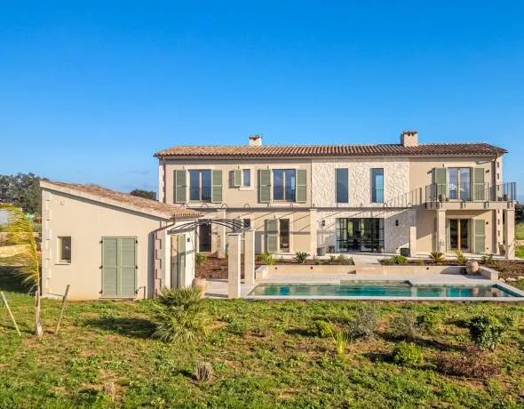 Entre los viñedos de Sencelles se encuentra esta excepcional finca que combina la arquitectura moderna con la autenticidad mallorquina. La piedra natural, los cálidos elementos de madera y los materiales seleccionados crean una atmósfera de elegancia atemporal. Las vistas panorámicas se extienden sobre los viñedos propios de la finca hasta la Tramuntana y la histórica iglesia del pueblo. La propiedad está enmarcada por muros tradicionales de piedra seca y un jardín mediterráneo cuidadosamente ajardinado; un viejo olivo en la entrada da la bienvenida a residentes e invitados.