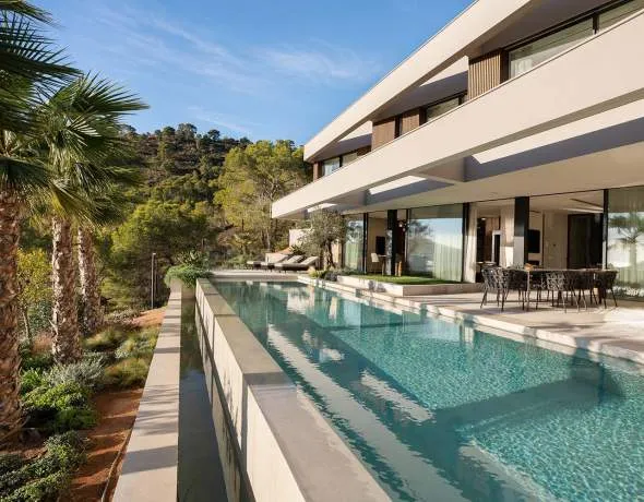 En una ubicación privilegiada en ladera, a pie de una reserva natural, se alza esta destacada villa de diseño con una vista inigualable sobre la costa, desde Camp de Mar hasta Santa Ponsa. La posición elevada no solo garantiza la máxima privacidad y una tranquilidad absoluta, sino también una vista despejada al mar y a la naturaleza circundante – desde todas las plantas.