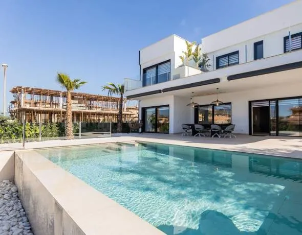 Ubicada en una tranquila zona residencial, esta villa de última generación, totalmente automatizada con el sistema KNX, combina lujo moderno, tecnología avanzada y eficiencia energética. La planta baja cuenta con una cocina de diseño abierto con suelos de porcelanato y electrodomésticos de alta gama, un amplio salón-comedor con acceso al jardín y una impresionante escalera iluminada por LED. También incluye un baño de invitados y un dormitorio doble.