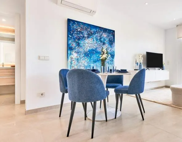 Estos modernos apartamentos decorados en estilo ibicenco tienen un acabado de muy alta calidad. Los apartamentos tienen mucha luz y espacio y disponen de 2 dormitorios con baño, salón-comedor y grandes terrazas o, en el caso de las plantas bajas, porches con jardín. Hay 2 grandes piscinas comunitarias que invitan a disfrutar de la vida mediterránea. Cada apartamento también cuenta con una plaza de aparcamiento.