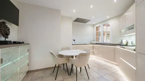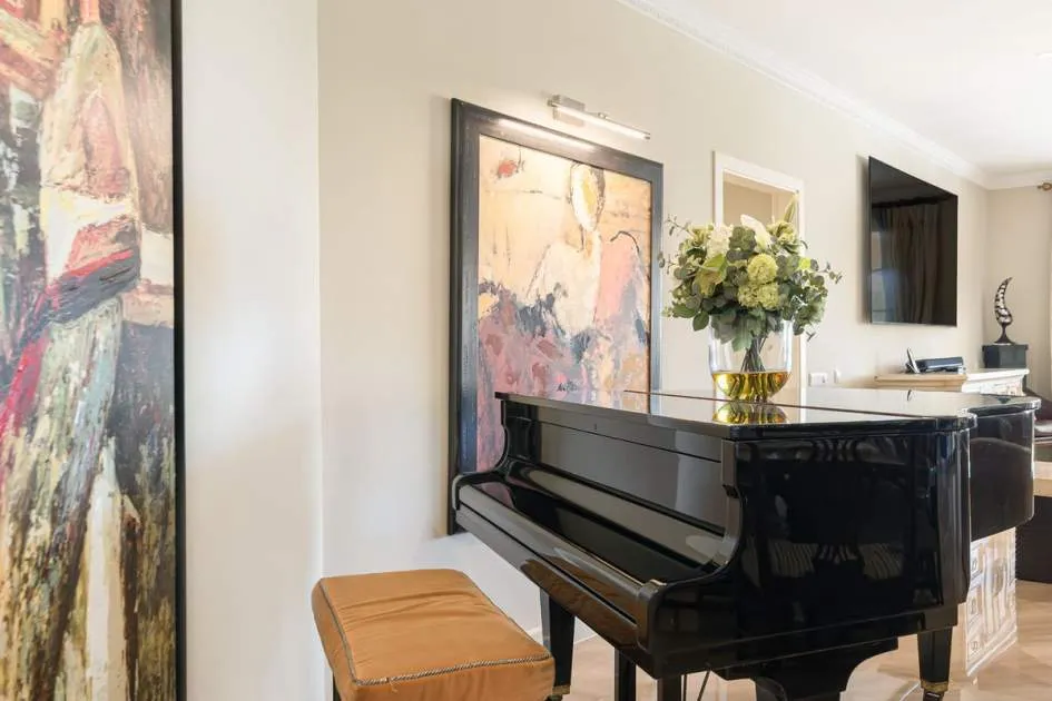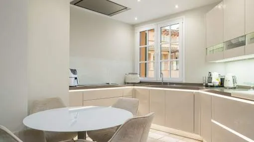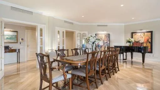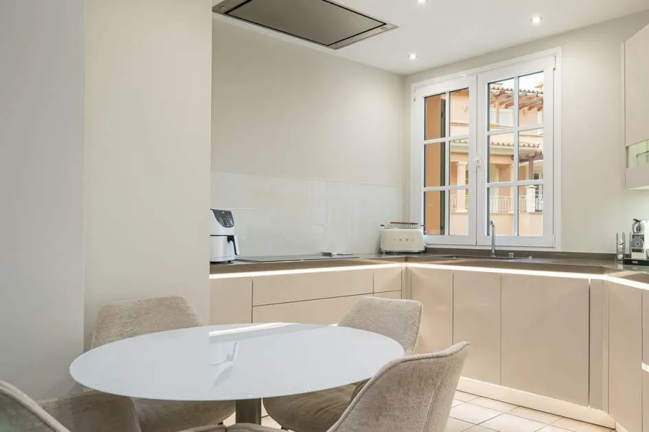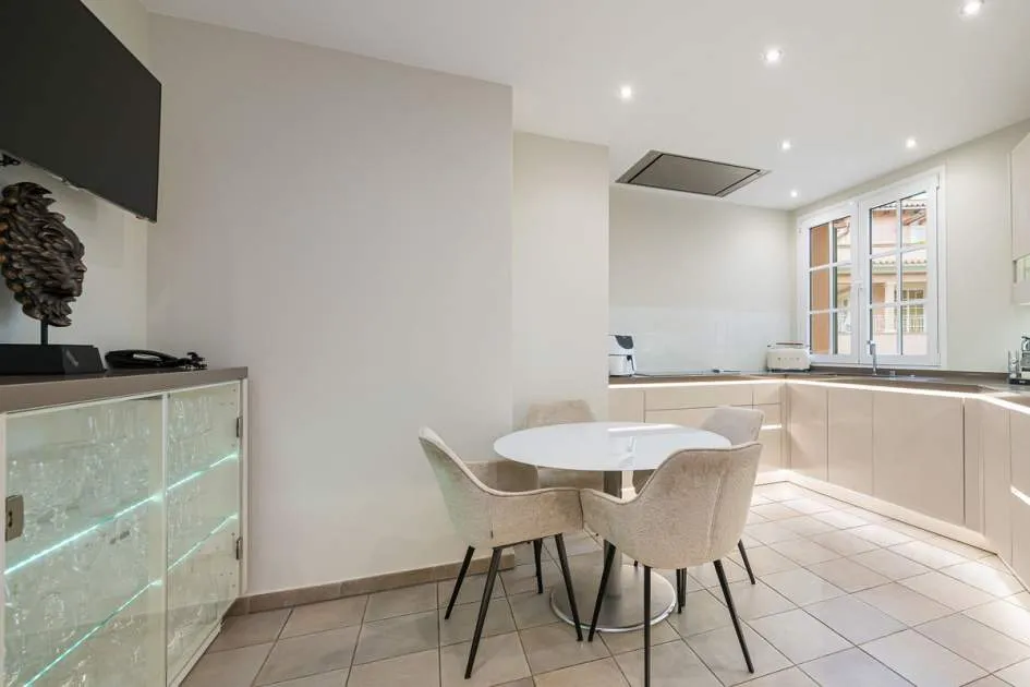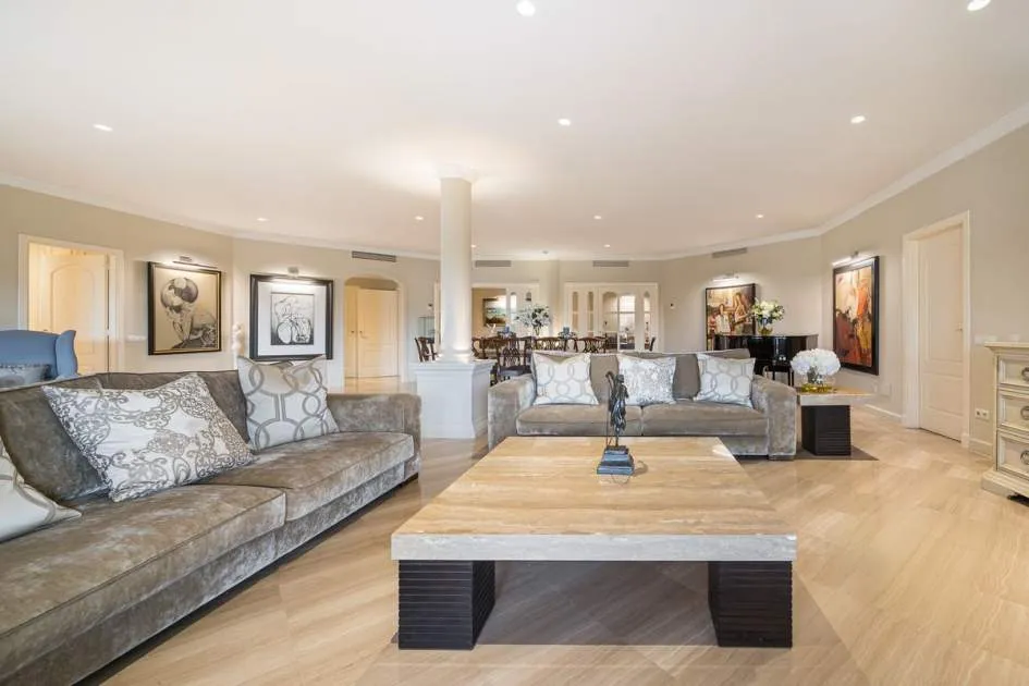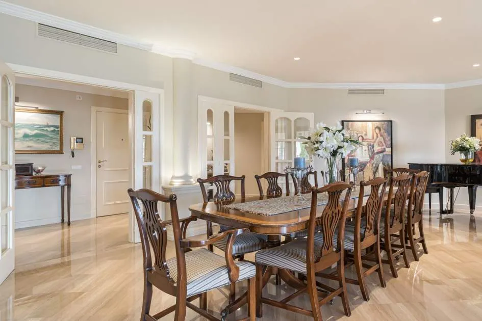 El apartamento, de 284 m², destaca por sus amplios espacios y su diseño elegante. Un gran recibidor conduce a un luminoso salón-comedor que se abre a una terraza cubierta de 50 m², ideal para relajarse frente a los jardines y disfrutar de las vistas parciales al mar. La cocina, moderna y totalmente renovada, es independiente y cuenta con un práctico cuarto de lavandería.