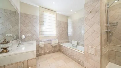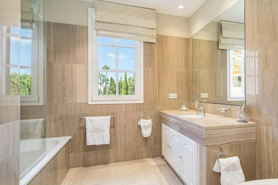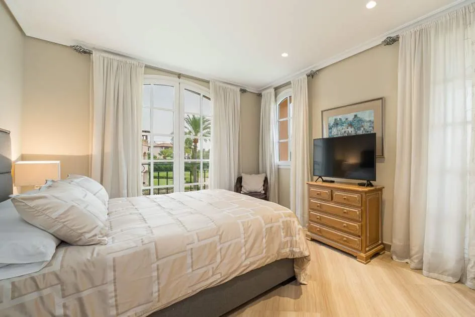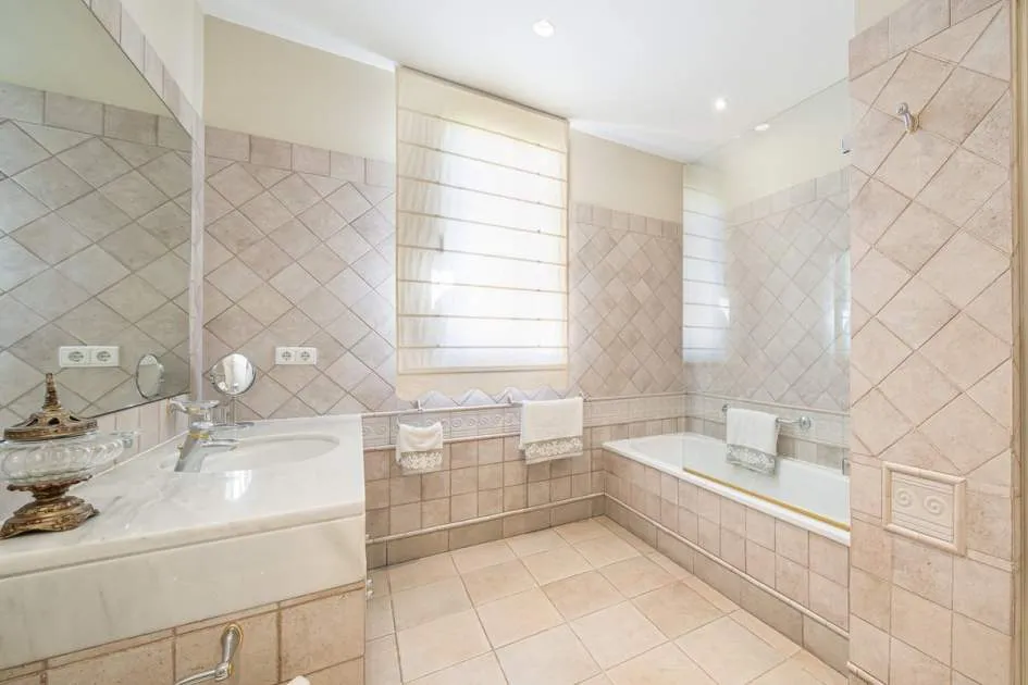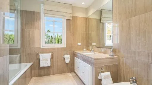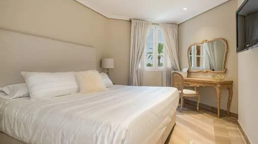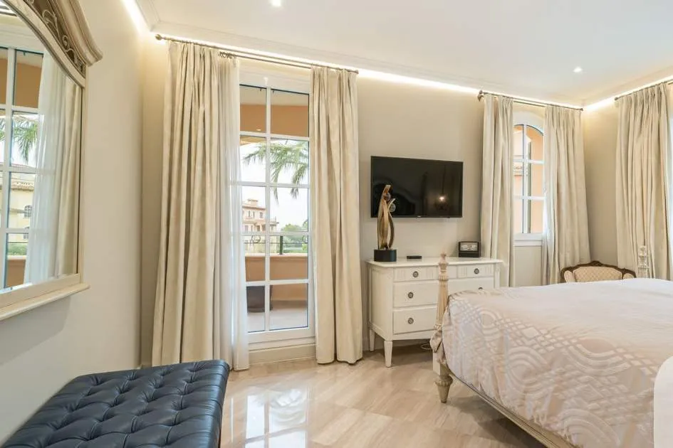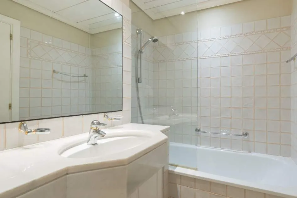 Dispone de 3 dormitorios dobles, cada uno con baño en suite y armarios empotrados, además de un aseo de cortesía. Entre sus acabados destacan los suelos de mármol, el aire acondicionado frío/calor, ventanas de doble acristalamiento y conexión WIFI.