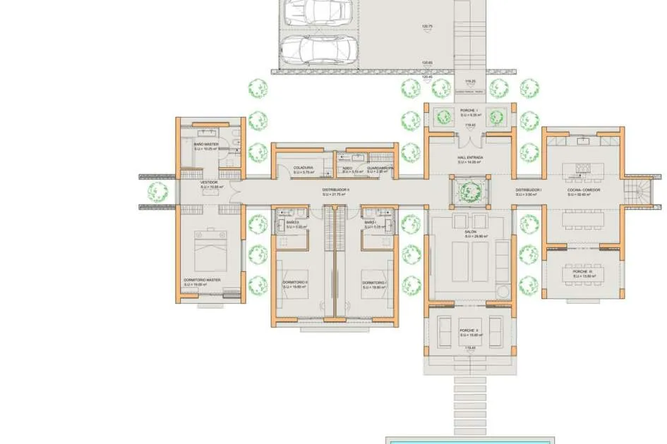 El proyecto contempla una vivienda de 3 dormitorios y 5 baños (3 baños completos y 2 aseos), con 346 m² útiles y 371 m² construidos, diseñada para separar inteligentemente las zonas sociales y privadas, maximizando la luz natural, las vistas despejadas y la comodidad diaria. Entre sus estancias destacan: